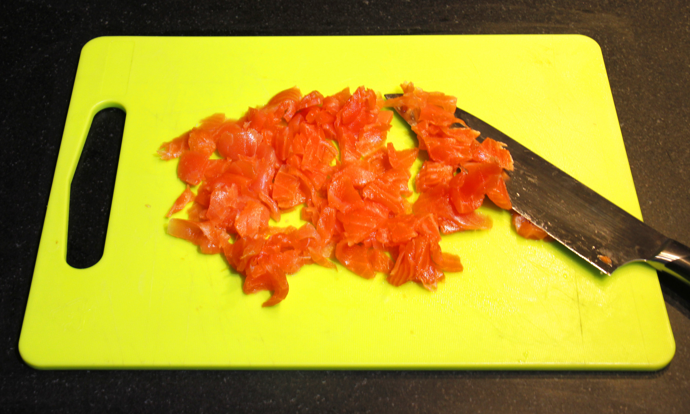 - Coupez le saumon en tout petits morceaux.