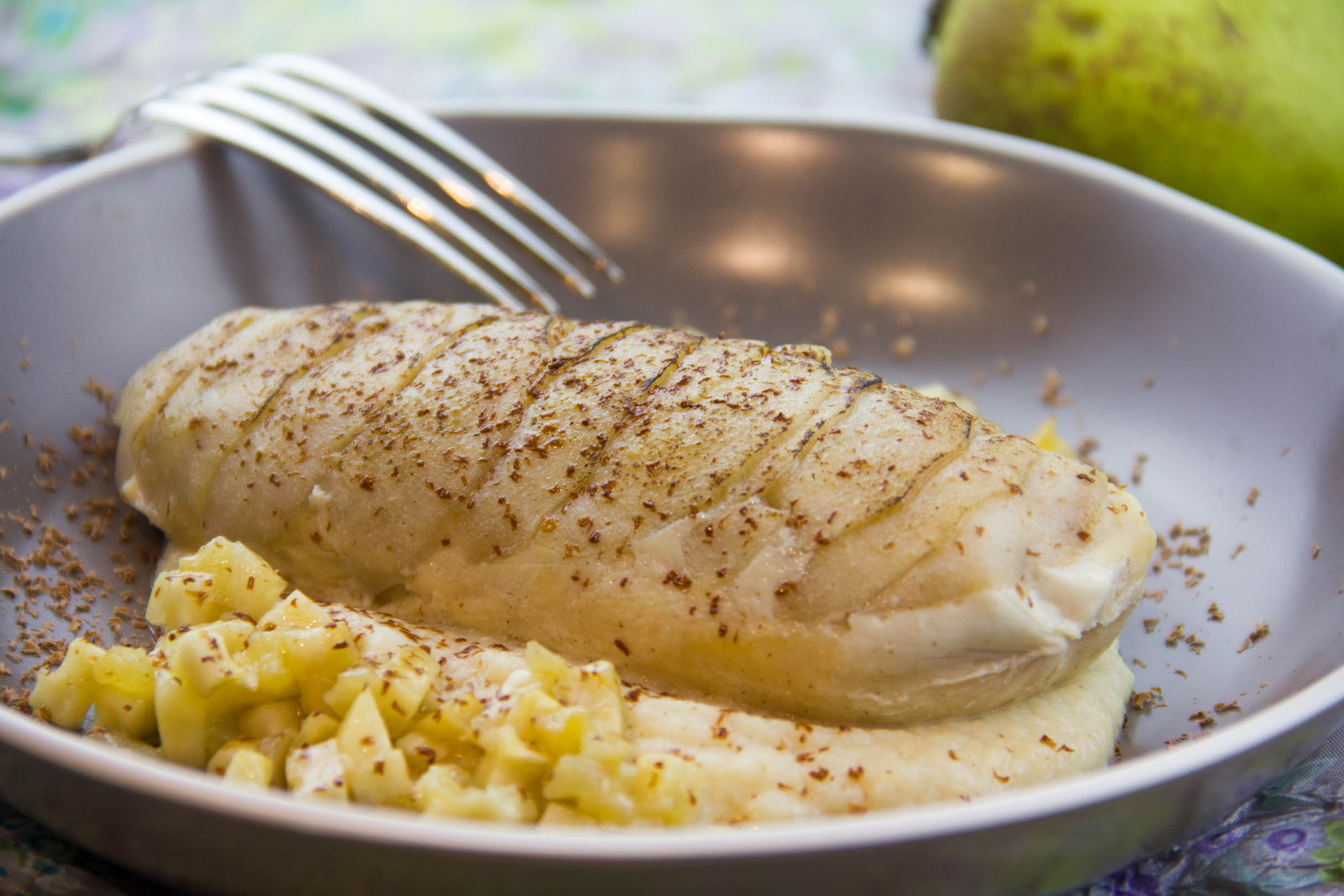 - Posez vos blancs de volaille sur le plan de travail; recouvrez généreusement le dessus de chaque blanc de farce fine puis disposez les tranches de poire d’un côté à l’autre comme les écailles d’un poisson.