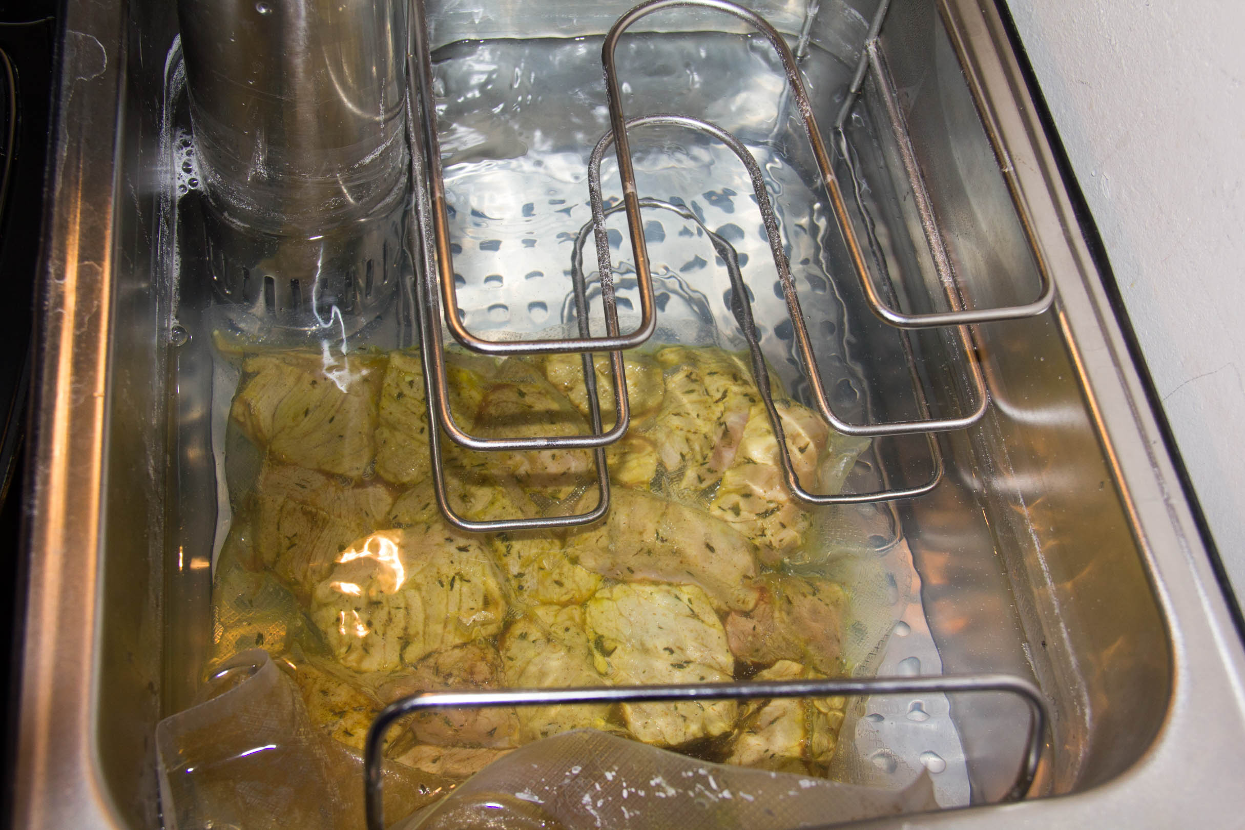 - Mettez sous vide les blancs de volaille emballés dans le film alimentaire.