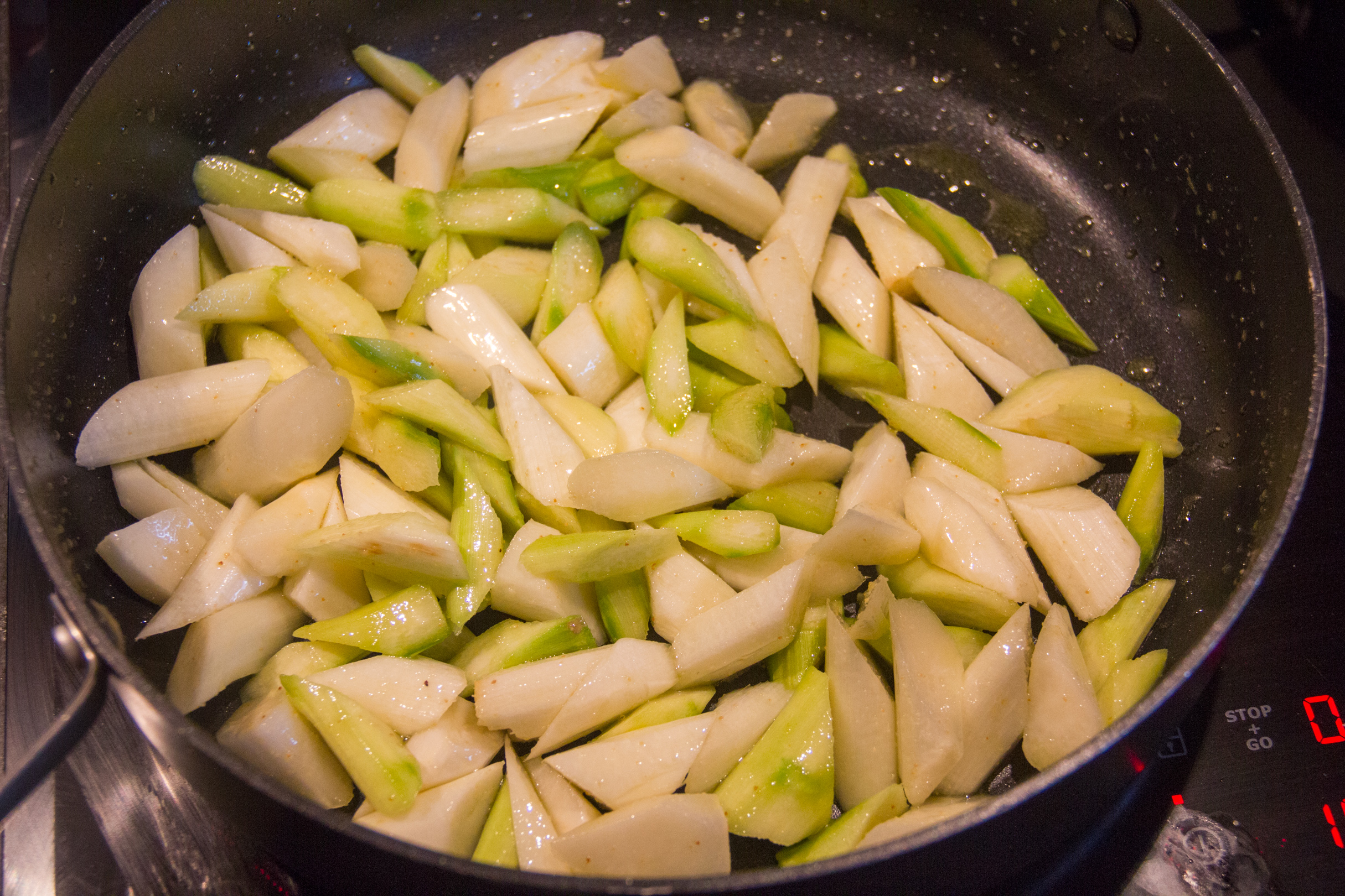 - Quand l’oignon est translucide ajoutez les dés de pommes de terre.