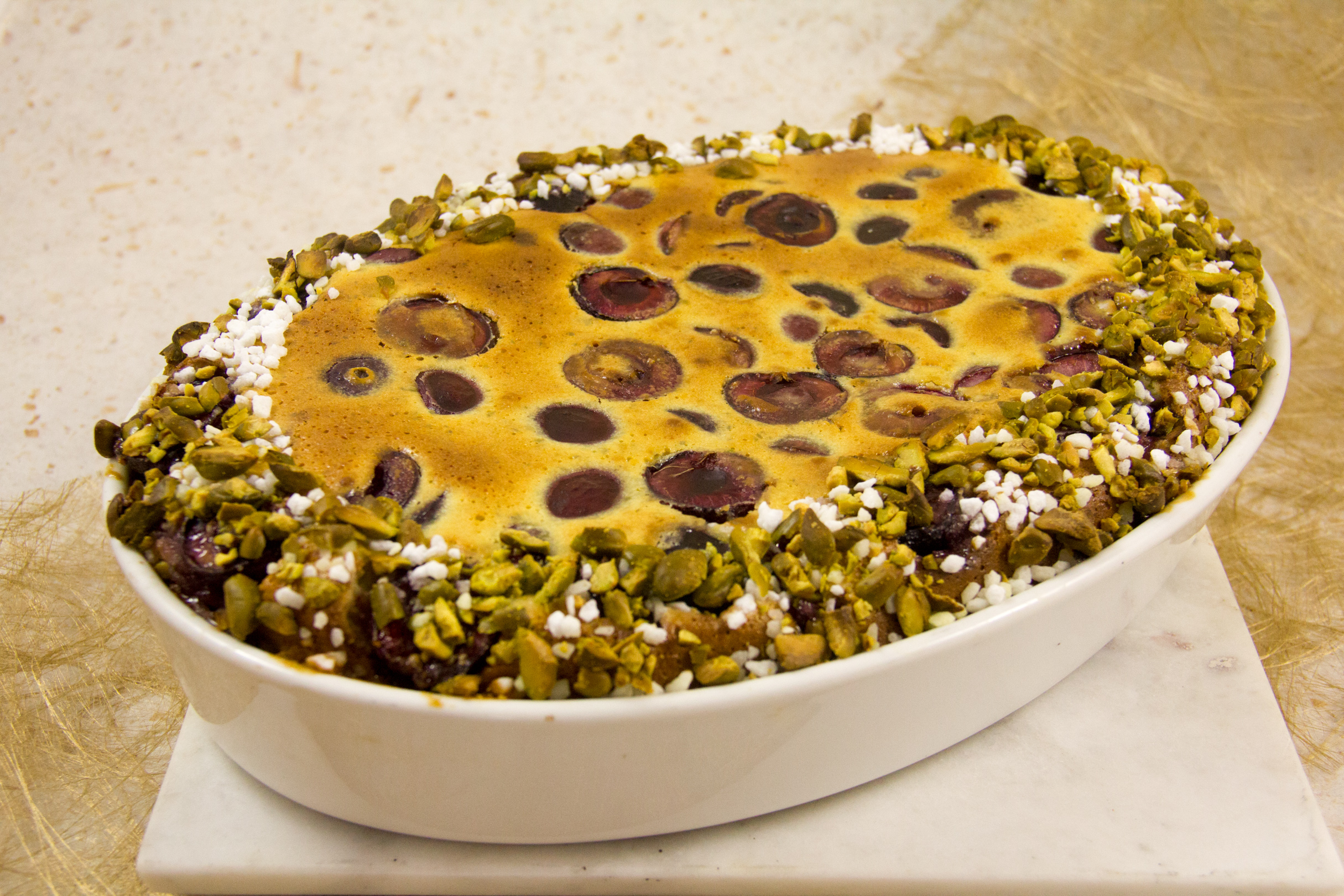 - Disposez les cerises dans un plat légèrement beurré. Versez la pâte par-dessus. Puis découpez dans un carton une forme semblable à celle de votre plat de présentation mais d’une dimension plus petite. Disposez-la sur le plat et saupoudrez tout le tour de pistaches torréfiées et de sucre perlé.