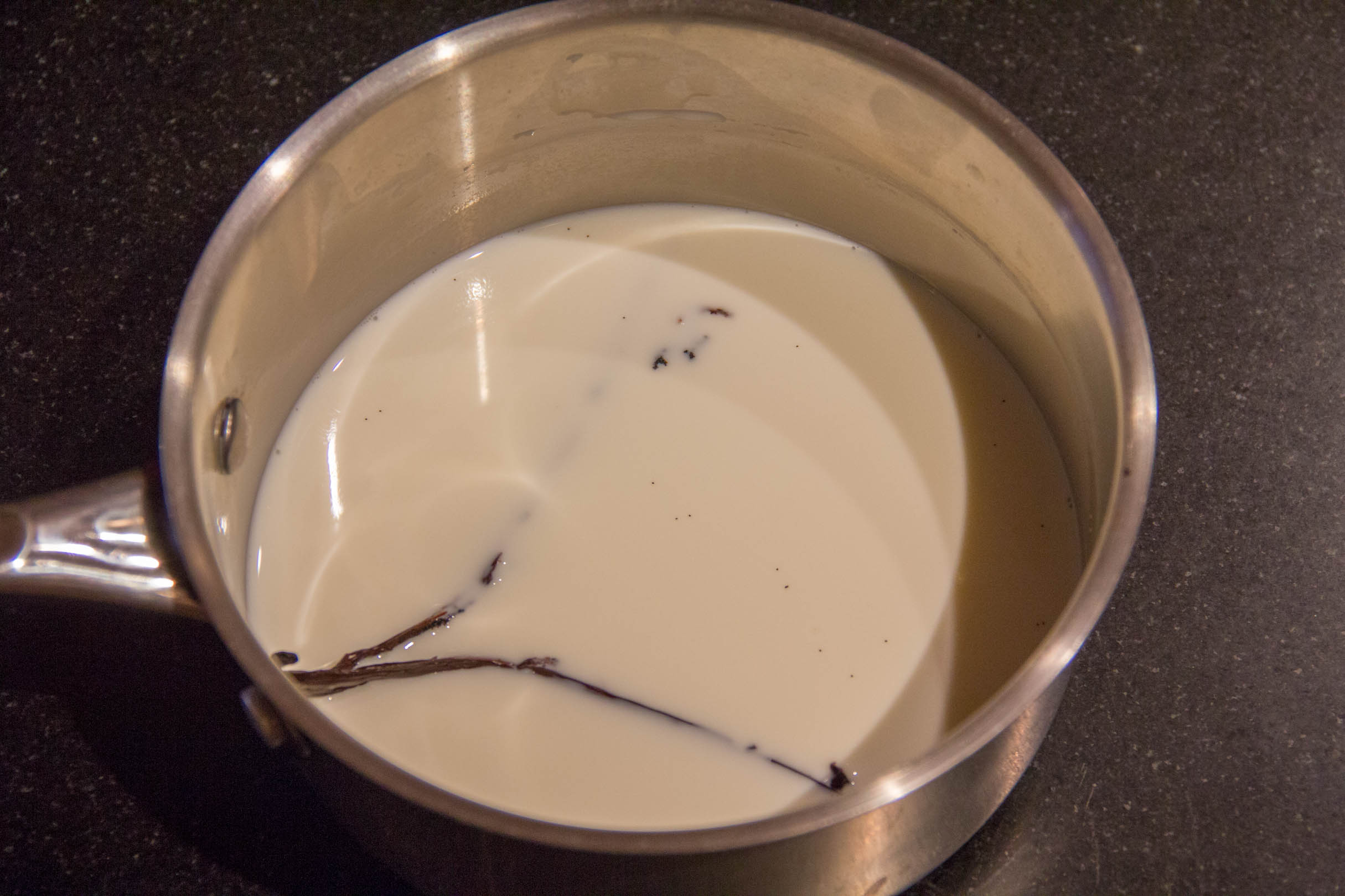 - Faites tiédir le lait avec la crème et infusez la gousse et les grains de vanille dans le lait pendant 15 mn. Retirez la gousse et réservez.