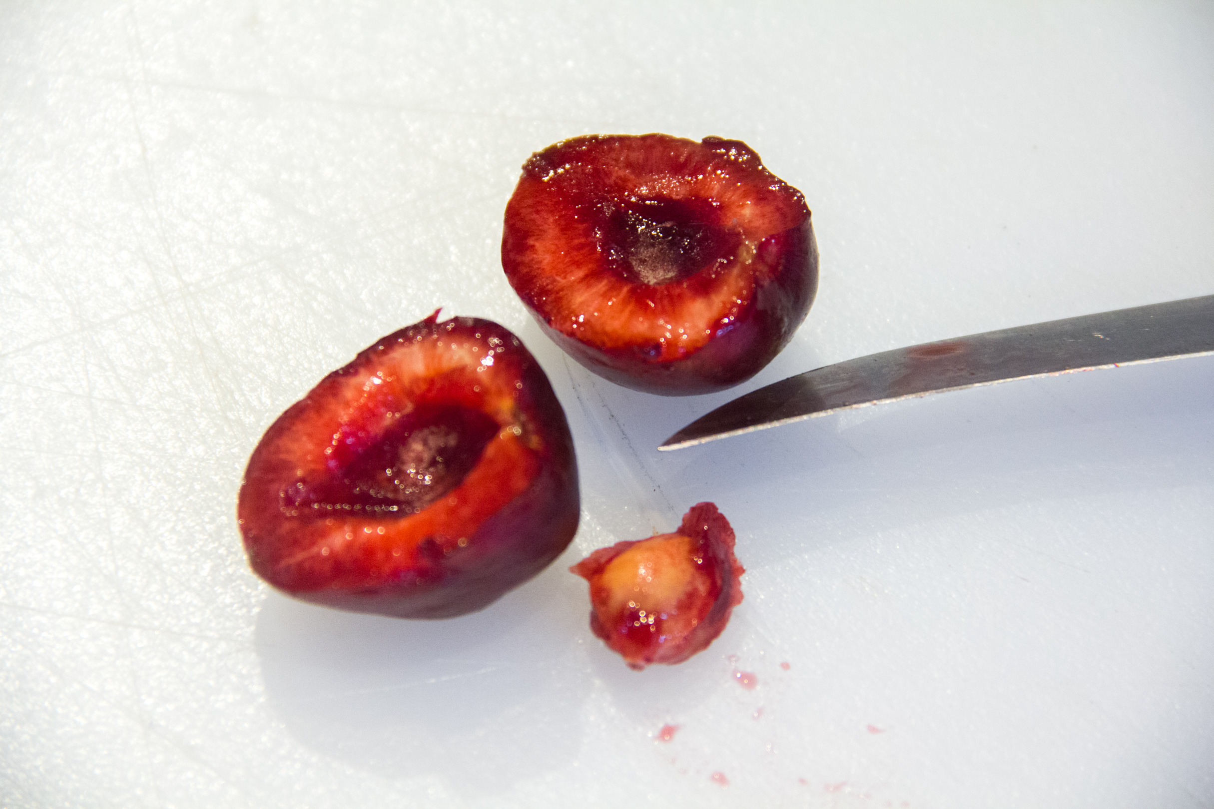 - Coupez les cerises en deux et dénoyautez-les.