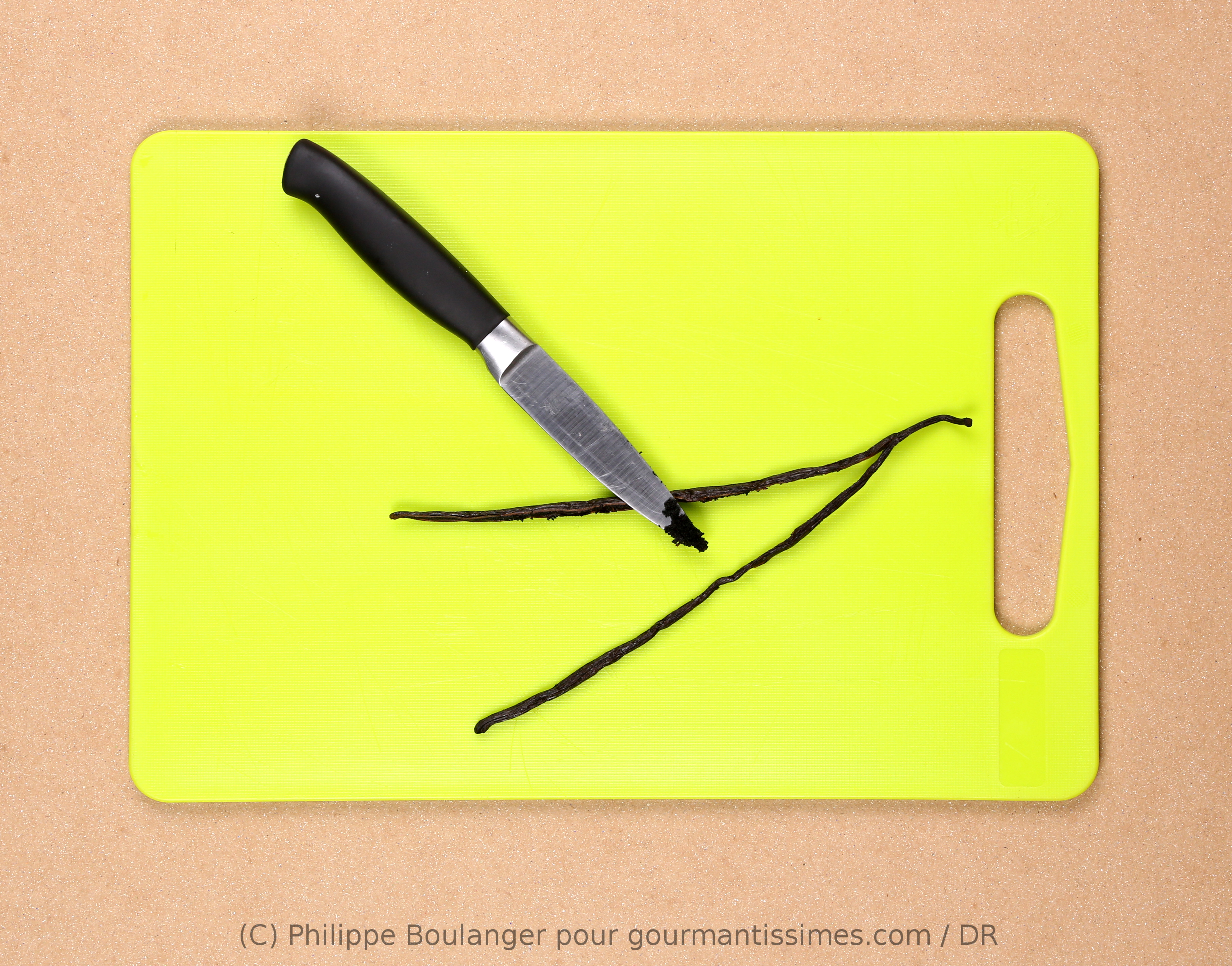 - une gousse de vanille. Choisissez bien vos gousses de vanille: elles ne doivent jamais avoir un aspect sec et desséché. Bien au contraire! Elles doivent être bien charnues et avoir un aspect gras et luisant.