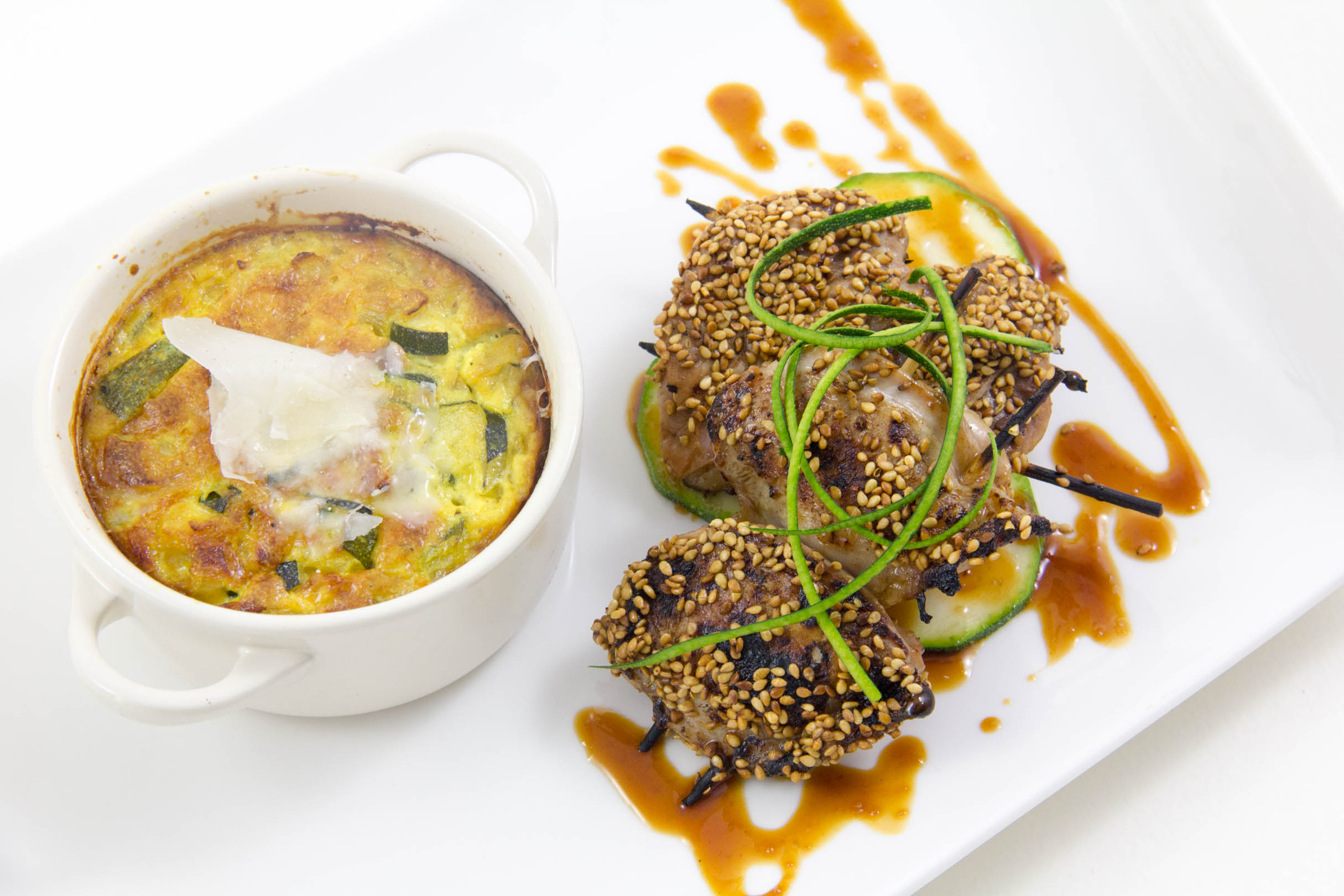 - Quand les brochettes sont cuites recouvrez-les d’un peu de marinade réduite (gardez-en un peu pour la présentation à l’assiette) et saupoudrez-les de graines de sésame.