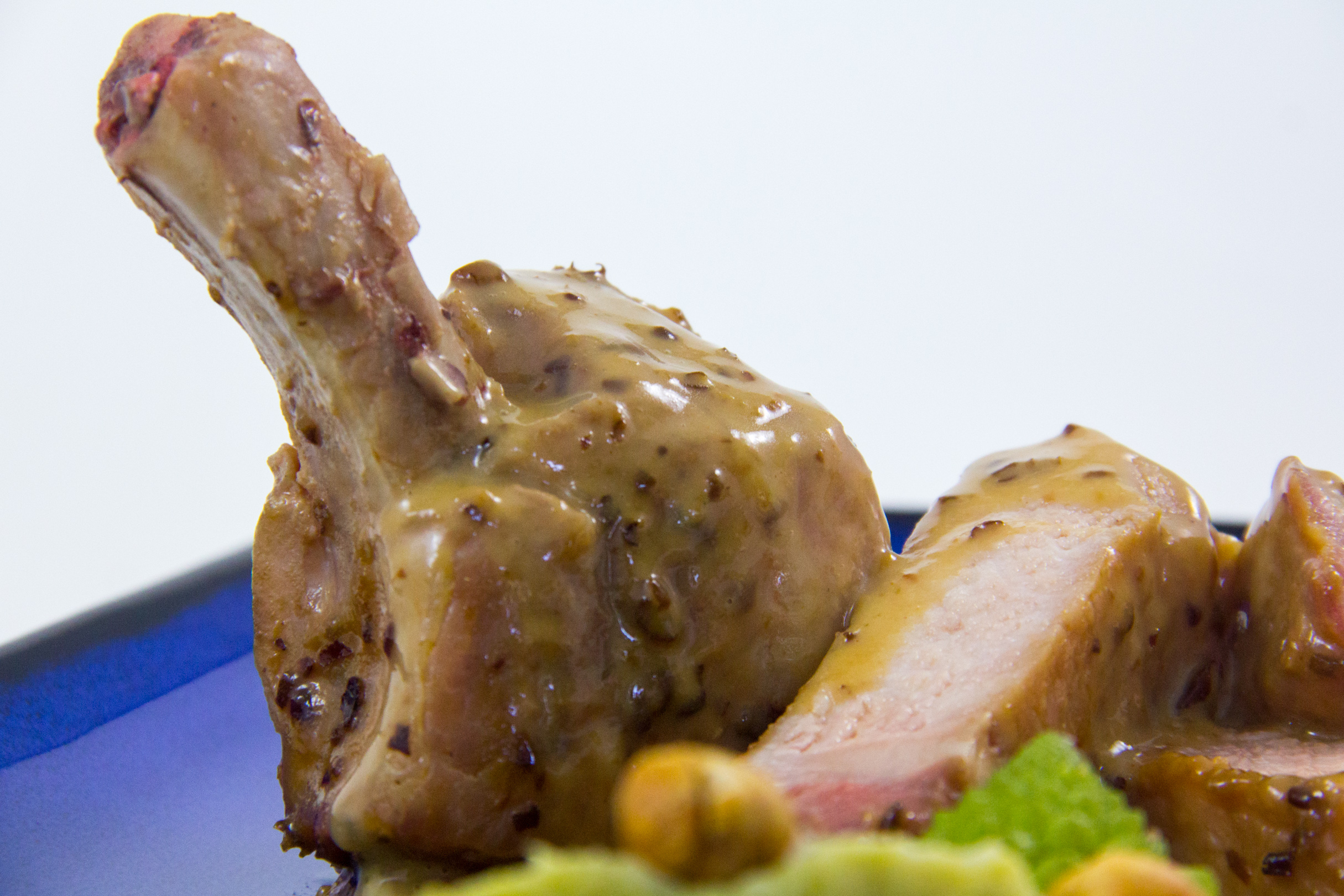 - A la fin de la cuisson de la viande, ouvrez le sachet et récupérez le jus rendu et versez le dans une casserole. Coupez chaque côte de porc en quatre morceaux de la manière suivante. Réservez au chaud à 65° au four, le temps de terminer la sauce et de réchauffer les purées.