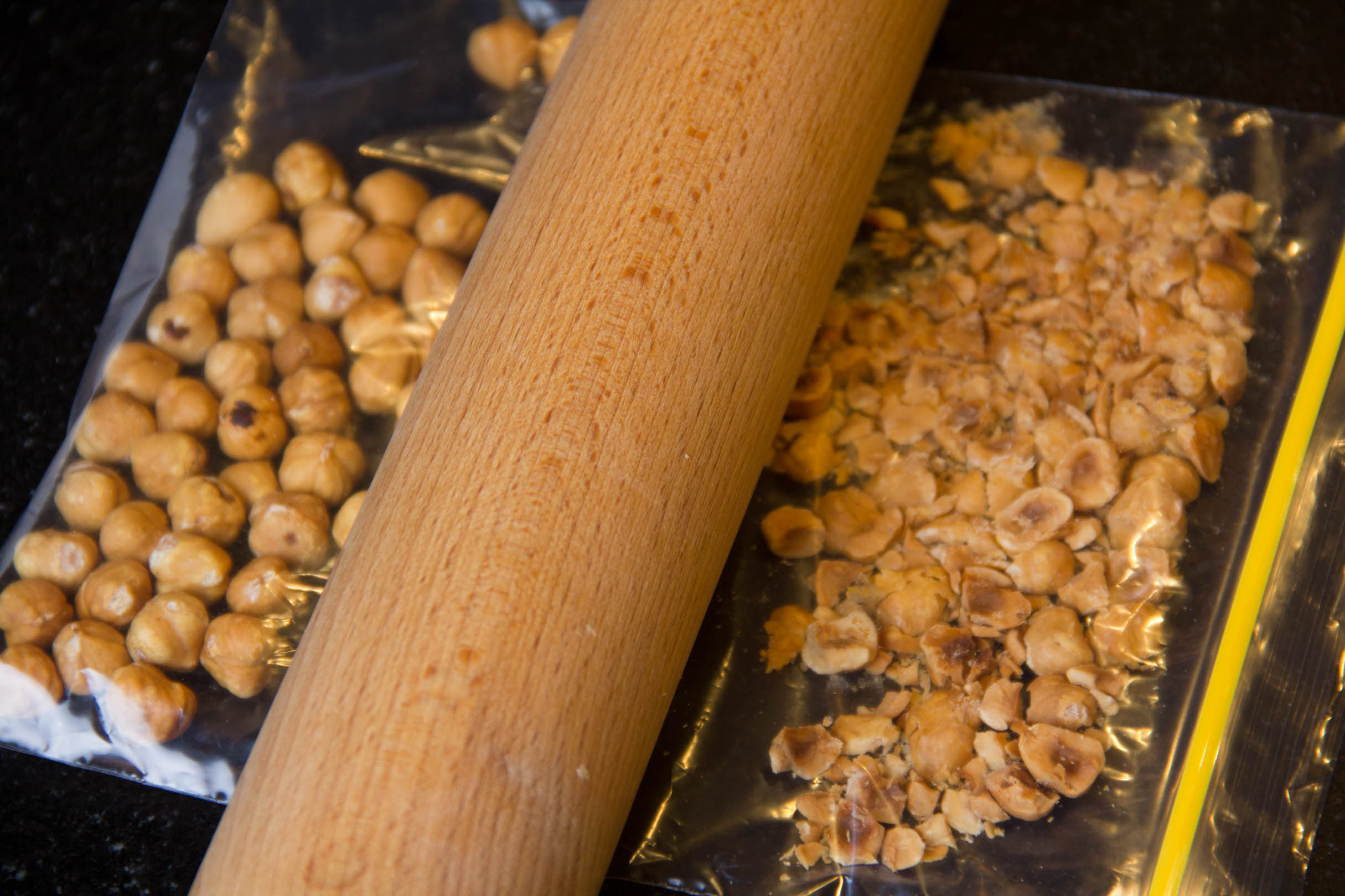 - Réservez 20 noisettes entières et mettez le reste des noisettes dans un sac plastique et écrasez-les grossièrement à l’aide d’un rouleau à pâtisserie. Réservez.