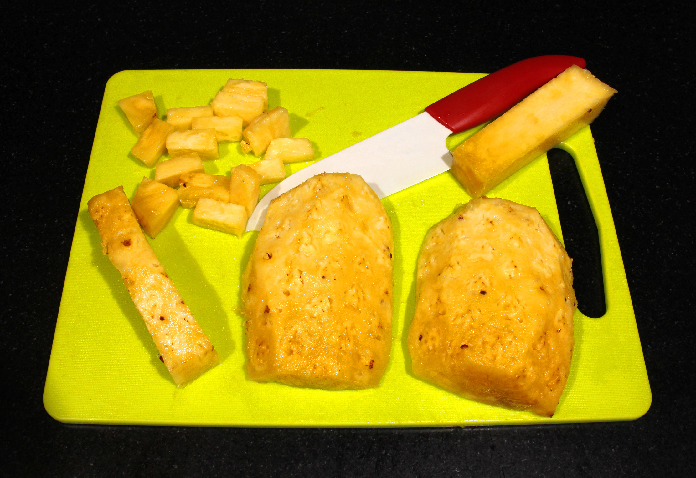 - Préparez les dés d’ananas: ôtez les côtés de l’ananas.