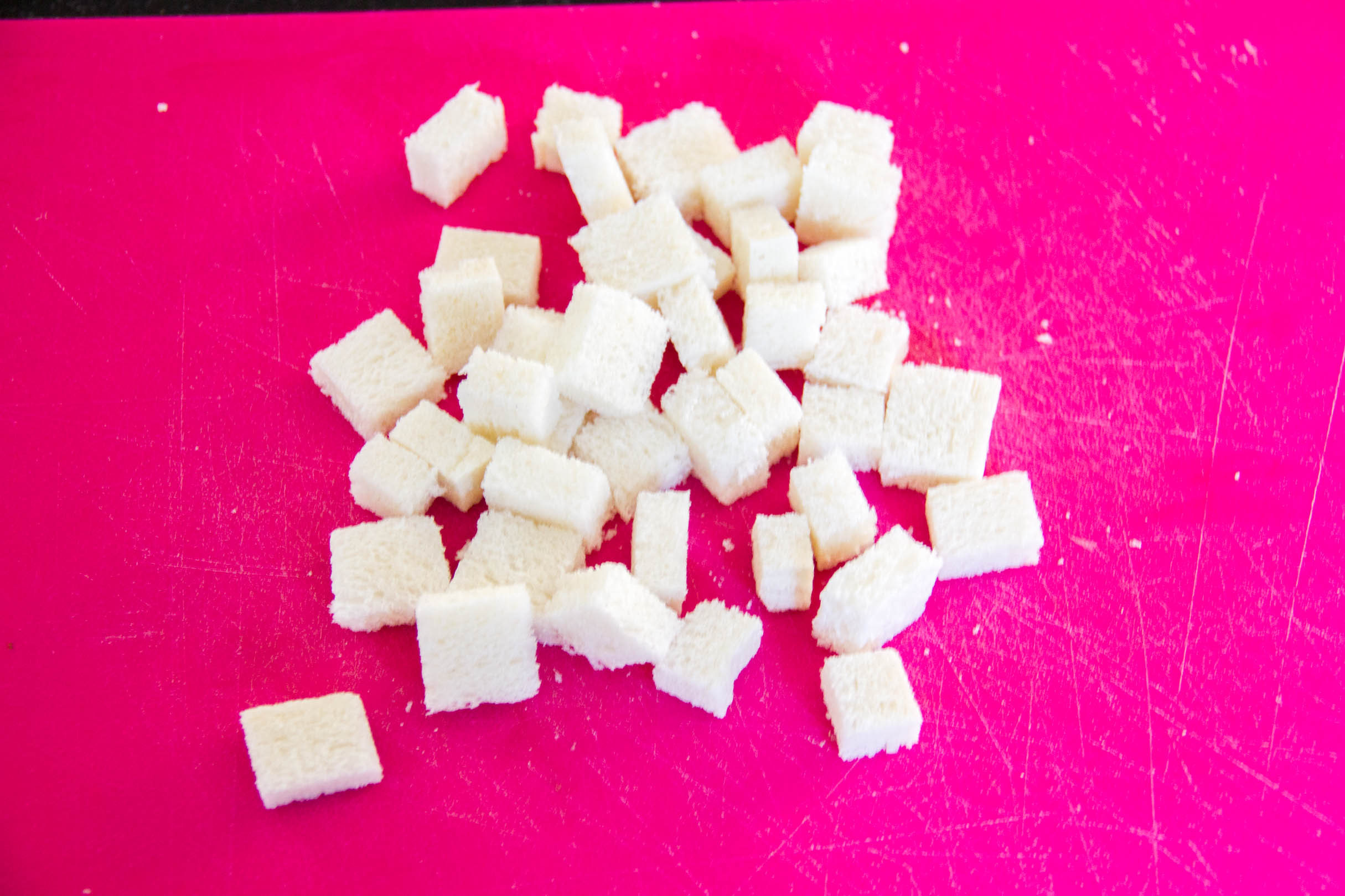 - Coupez les tranches de brioches en cubes.