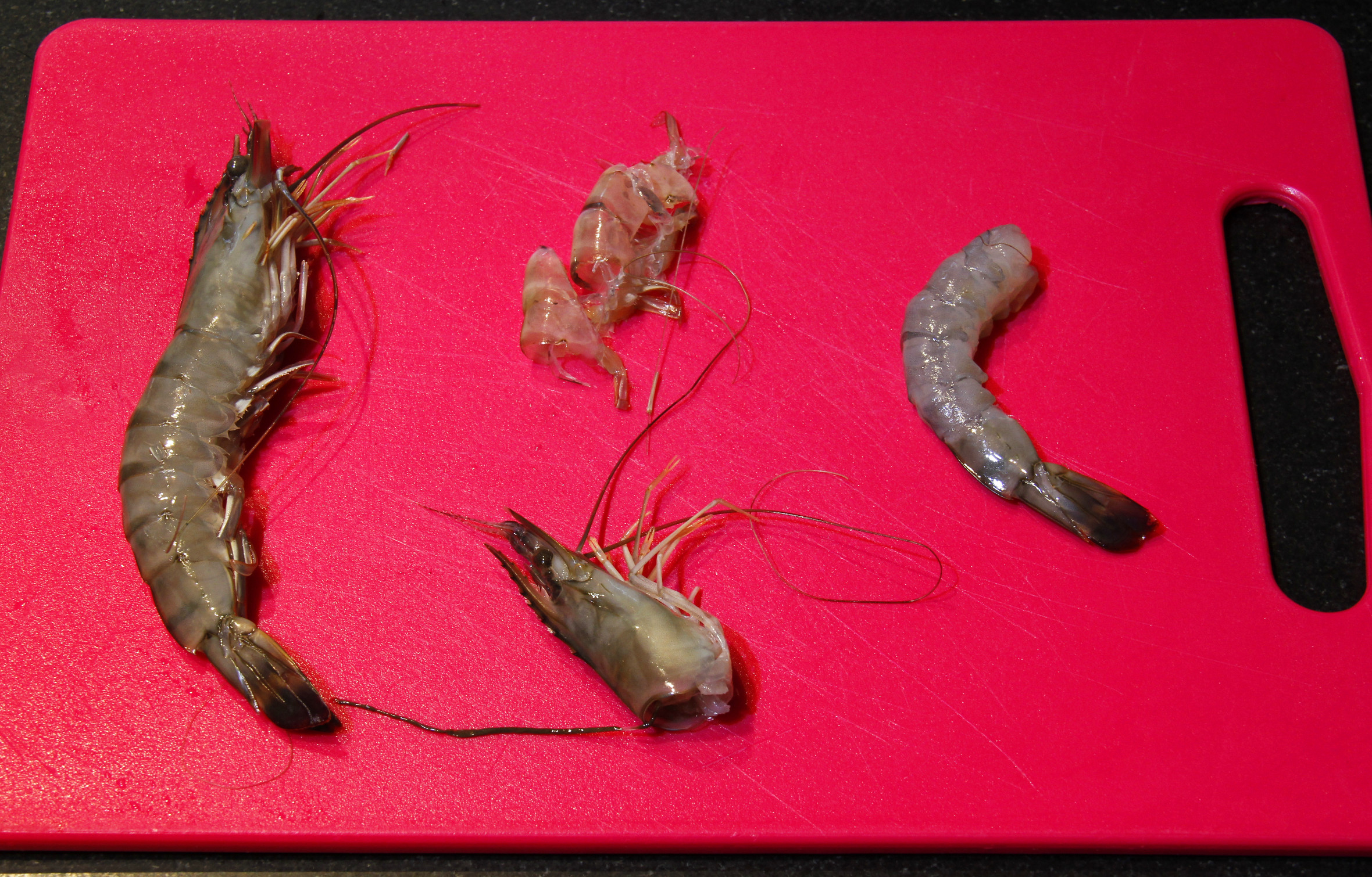 - Enlevez la tête des crevettes en prenant soin d’ôter en même temps le petit boyau. Pincez la tête entre vos doigts et tirez doucement; le petit boyau vient avec la tête. Terminez en ôtant la carapace qui s’enlève facilement.