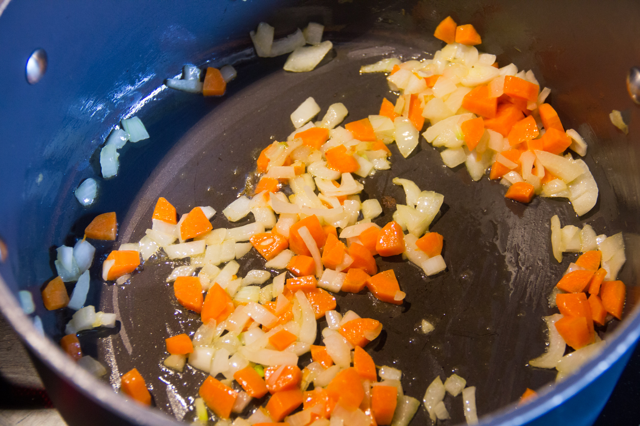 - Taillez la carotte, le poireau et l’oignon en petite brunoise (tout petits morceaux). Faites les revenir quelques minutes avec un peu de beurre.