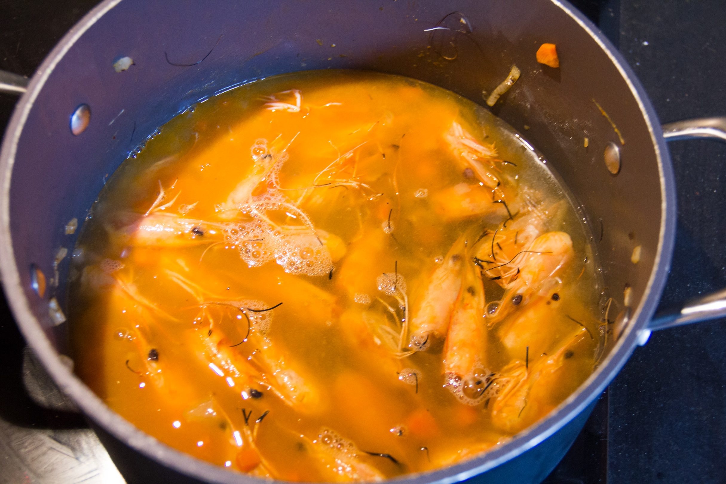 - Mouillez les têtes de crevette à hauteur avec de l’eau et laissez cuire à feu doux pendant 20 mn et à couvert. Volontairement je ne mets pas de concentré de tomate comme dans une bisque traditionnelle.