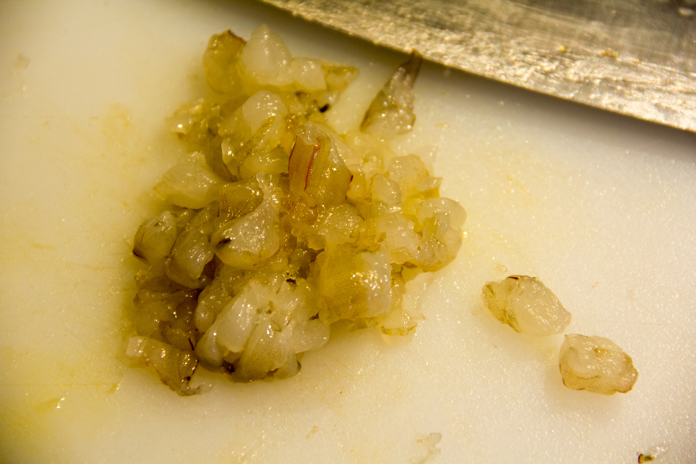 - Taillez les corps de crevettes en petits dés et réservez-les au frais. Gardez bien les têtes pour l’étape suivante.