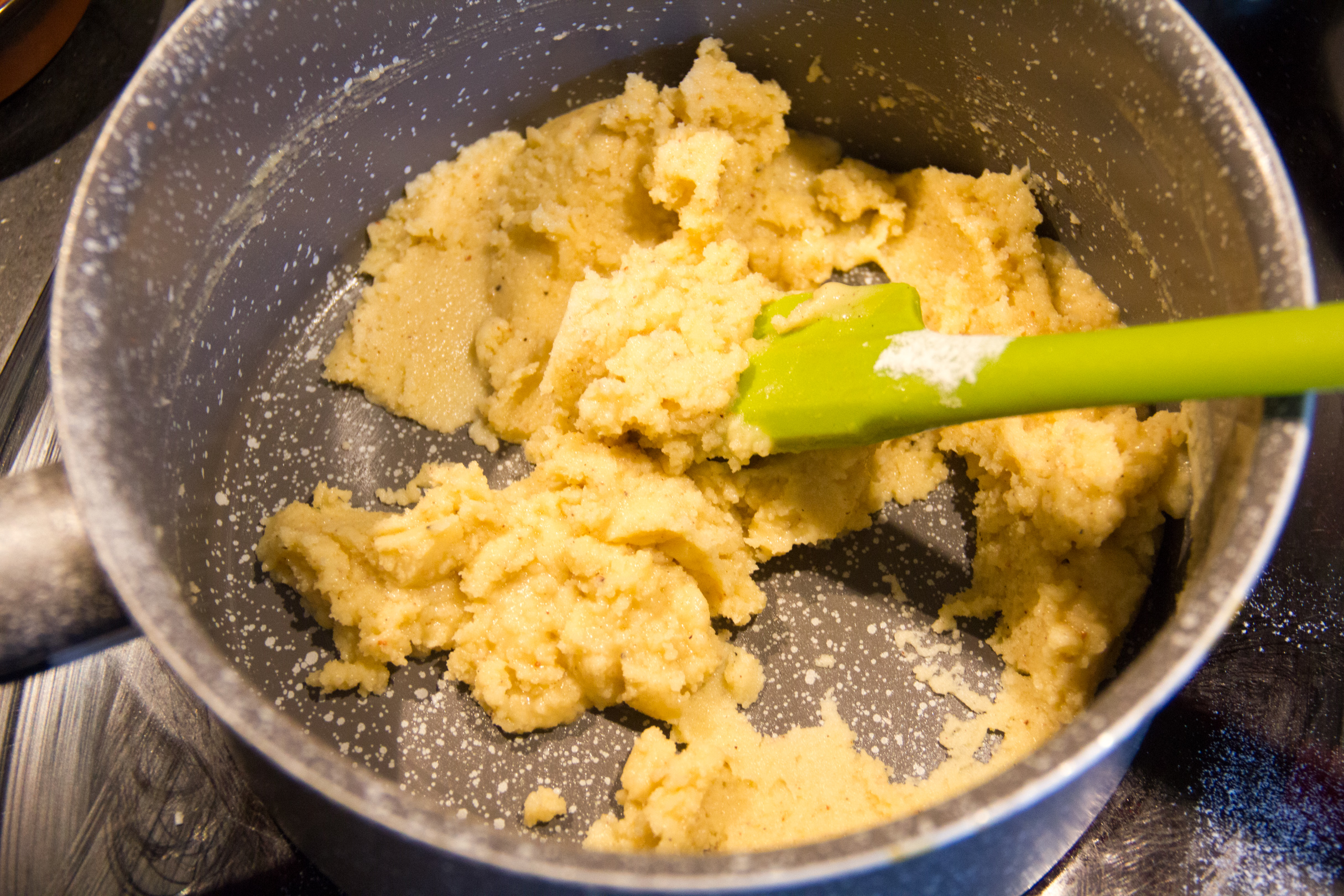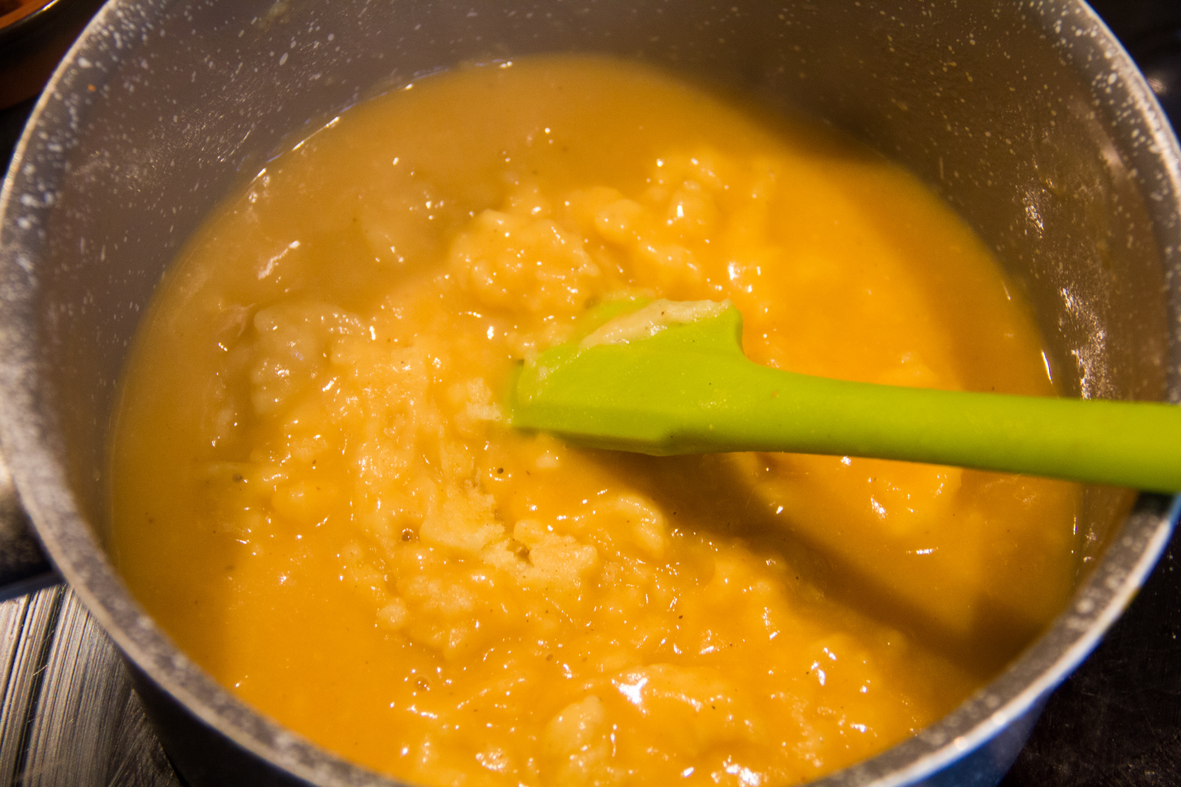- Remettez la casserole sur le feu et rajoutez le jus des têtes de crevettes. Mélangez en permanence. La pâte devient plus solide et se détache de la paroi (consistance d’une pâte à chou).