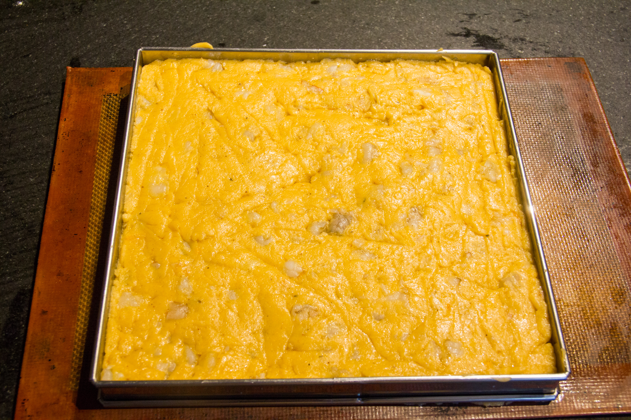 - Dressez immédiatement le mélange dans votre cadre posé sur une surface anti adhésive. Laissez au frais pour la nuit.