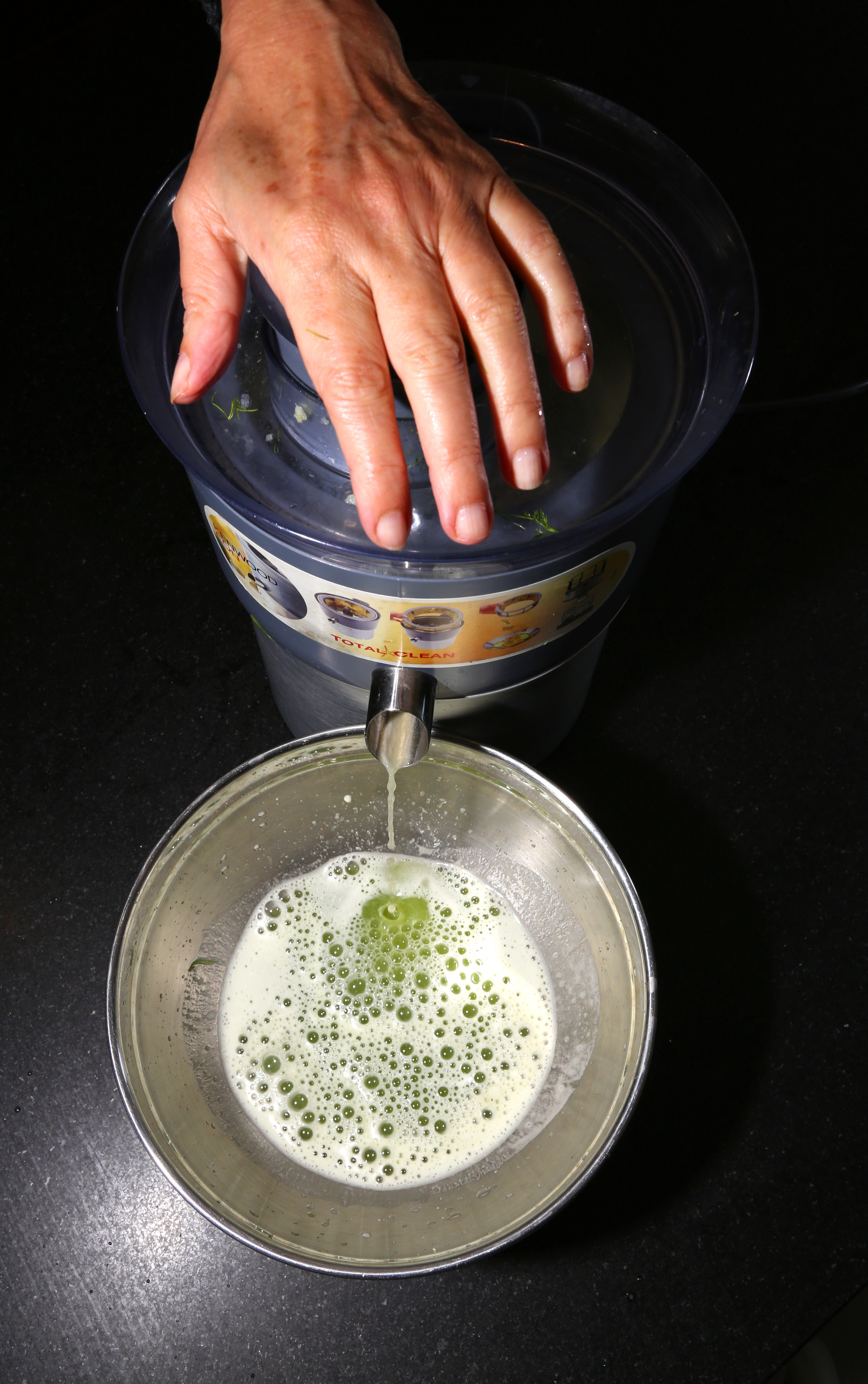 - Nettoyez et coupez la rhubarbe en tronçons. Passez la à la centrifugeuse pour obtenir 150 ml de jus.