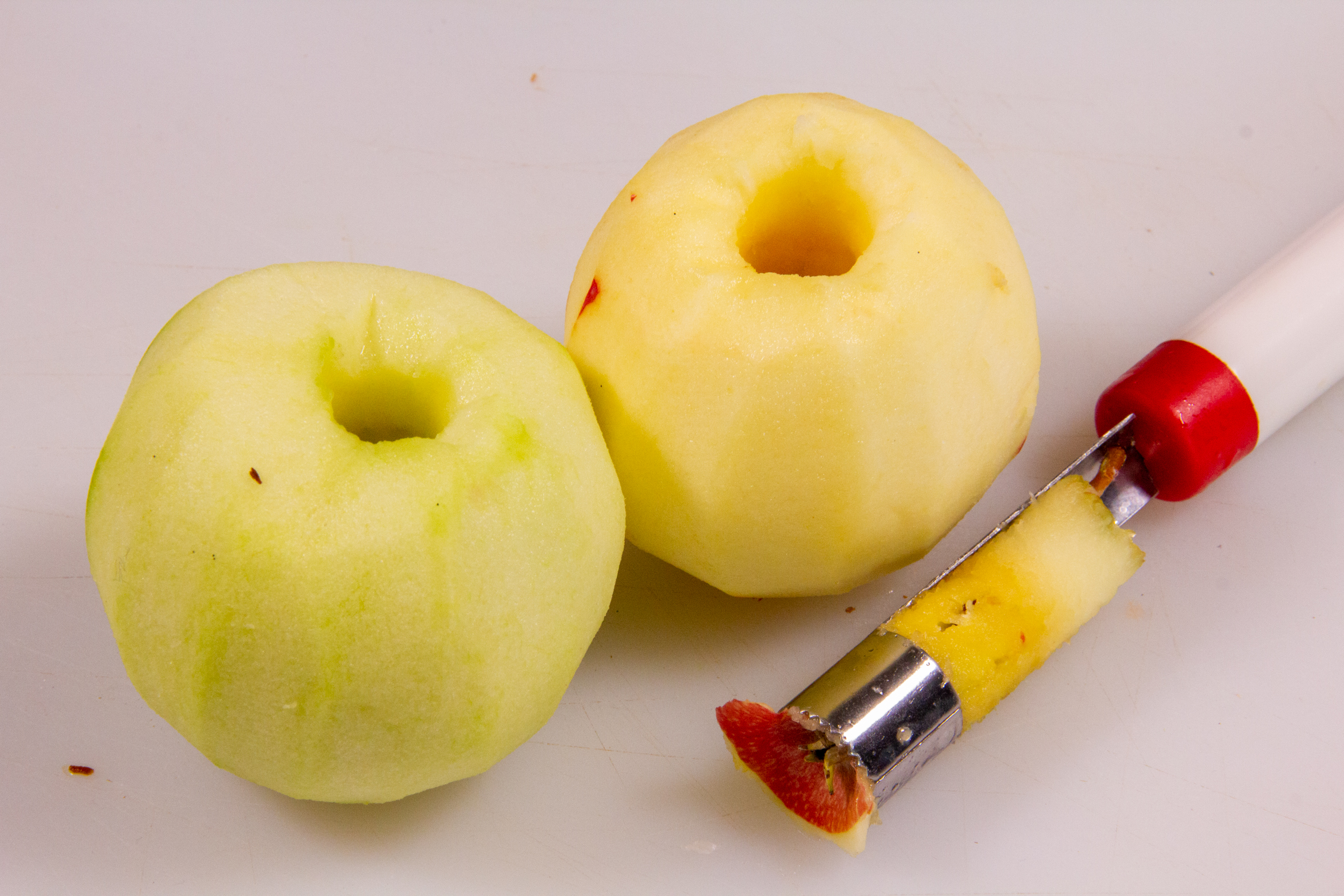 - Epluchez les pommes et ôtez le cœur avec un vide pomme.