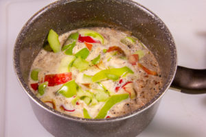 - Versez dans une casserole le lait , la crème, le sucre cassonade, les épices de votre choix, les grains de vanille ainsi que les gousses de vanille. Ajoutez-y les épluchures des pommes et faites chauffer à feu doux. Laissez frémir deux minutes; coupez le feu et filmez avec du film alimentaire pendant 15 minutes pour laisser infuser le tout.
