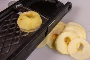 - Tranchez les pommes à l’aide d’une mandoline pour obtenir des tranches bien fines et régulières.