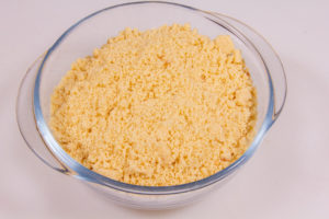 - Commencez par préparer le crumble: dans un plat mélangez la farine, la poudre d’amande et la cassonade. Puis ajoutez le beurre et mélanger à la main de manière à former une pâte grumeleuse. Réservez.