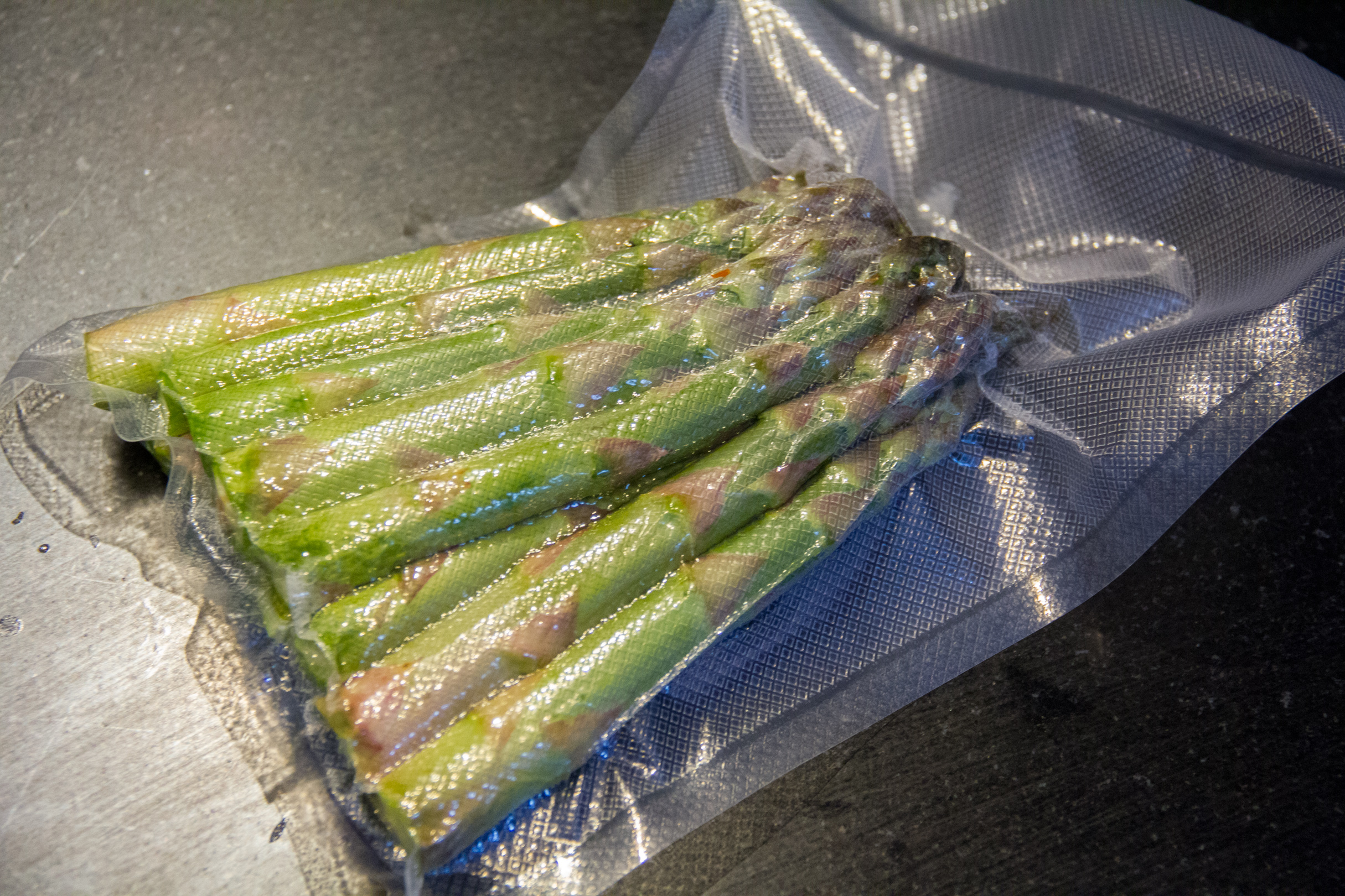 - Mettez les asperges sous vide avec une noix de beurre, une pincée de sel et de poivre. Cuisez les asperges sous vide basse température au bain marie à l’aide de votre thermoplongeur à 90° pendant une heure.