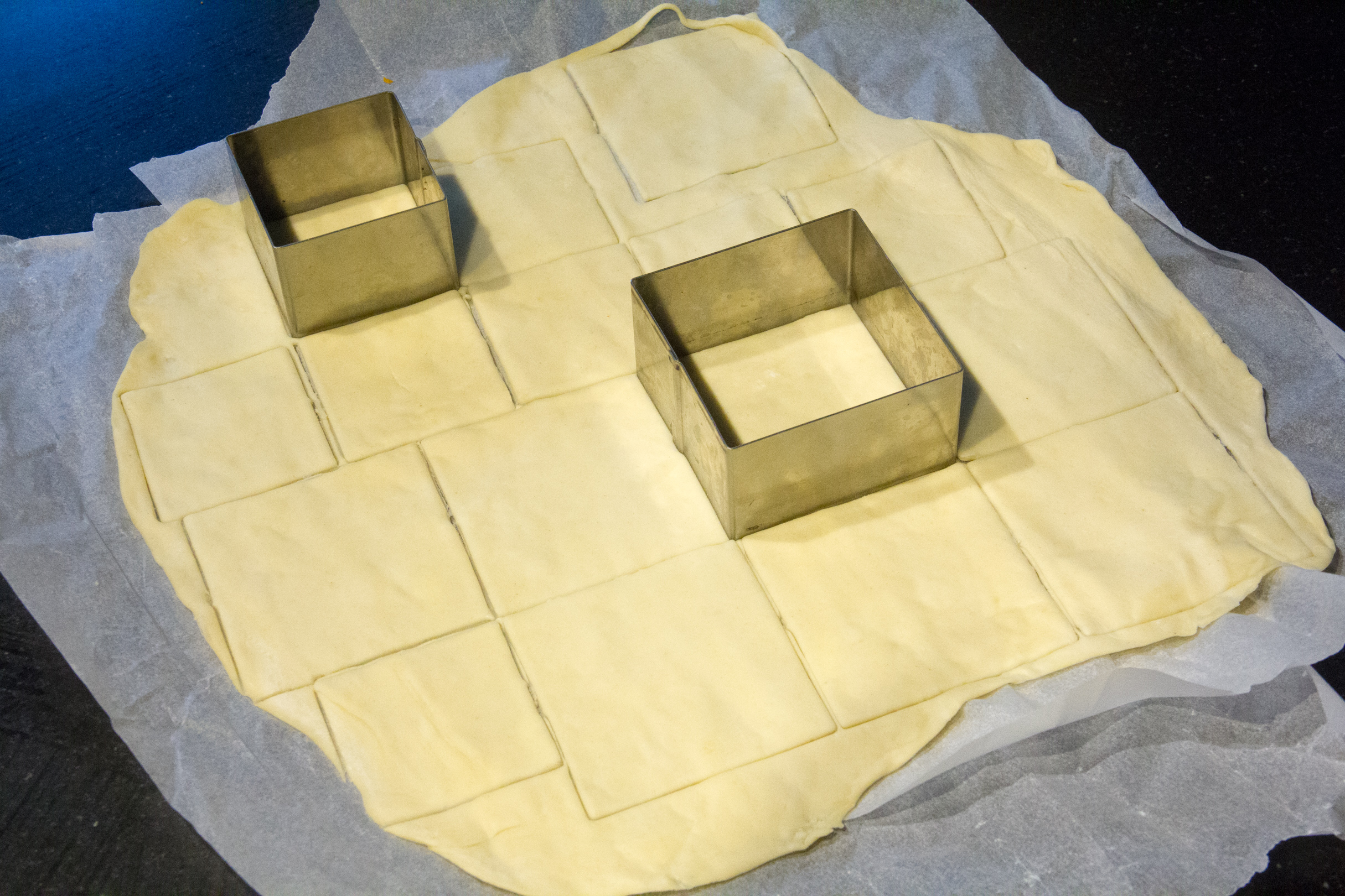 - Découpez la pâte feuilletée à l’aide d’emporte pièce. J’ai utilisé deux emportes pièces de taille différente: le plus grand pour la base du feuilleté et le plus petit pour réaliser un chapeau…Il vous faudra donc deux carrés de pâte pour chaque feuilleté, un grand et un plus petit.