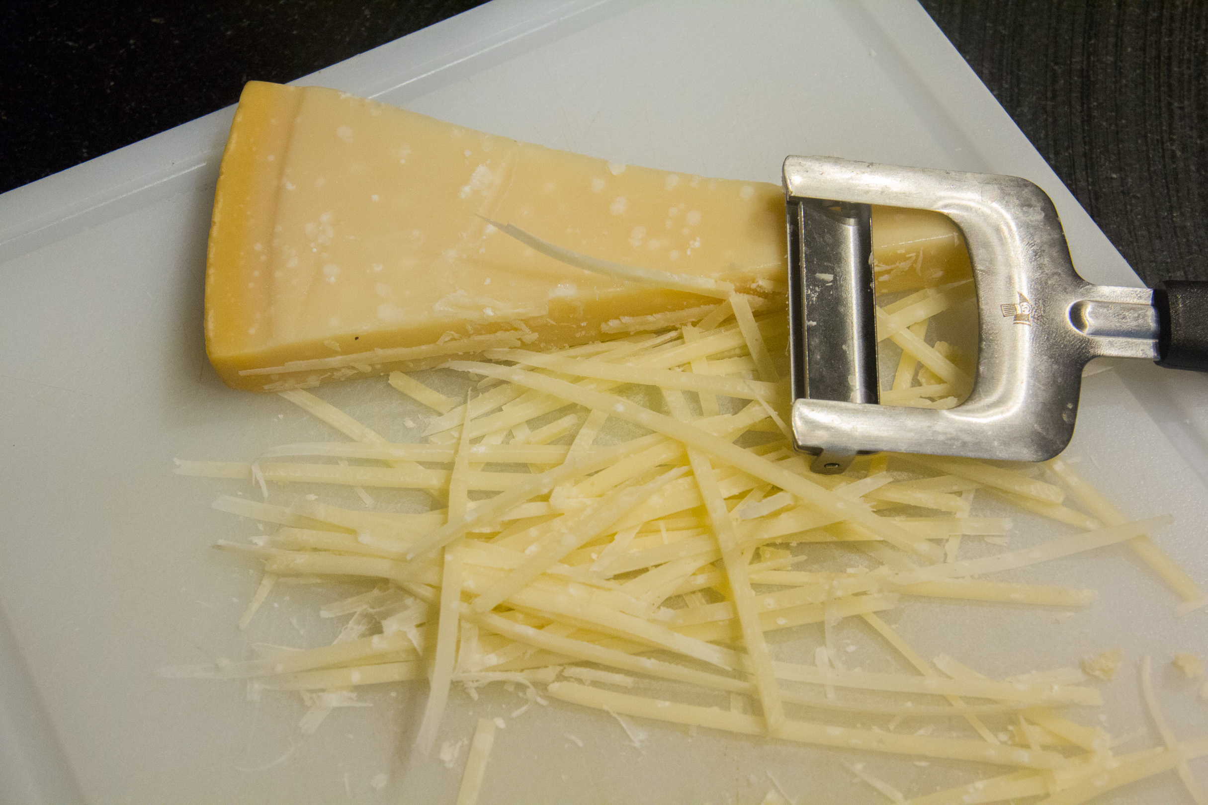 - Prélevez des lanières de parmesan sur le morceau de parmesan. Réservez.
