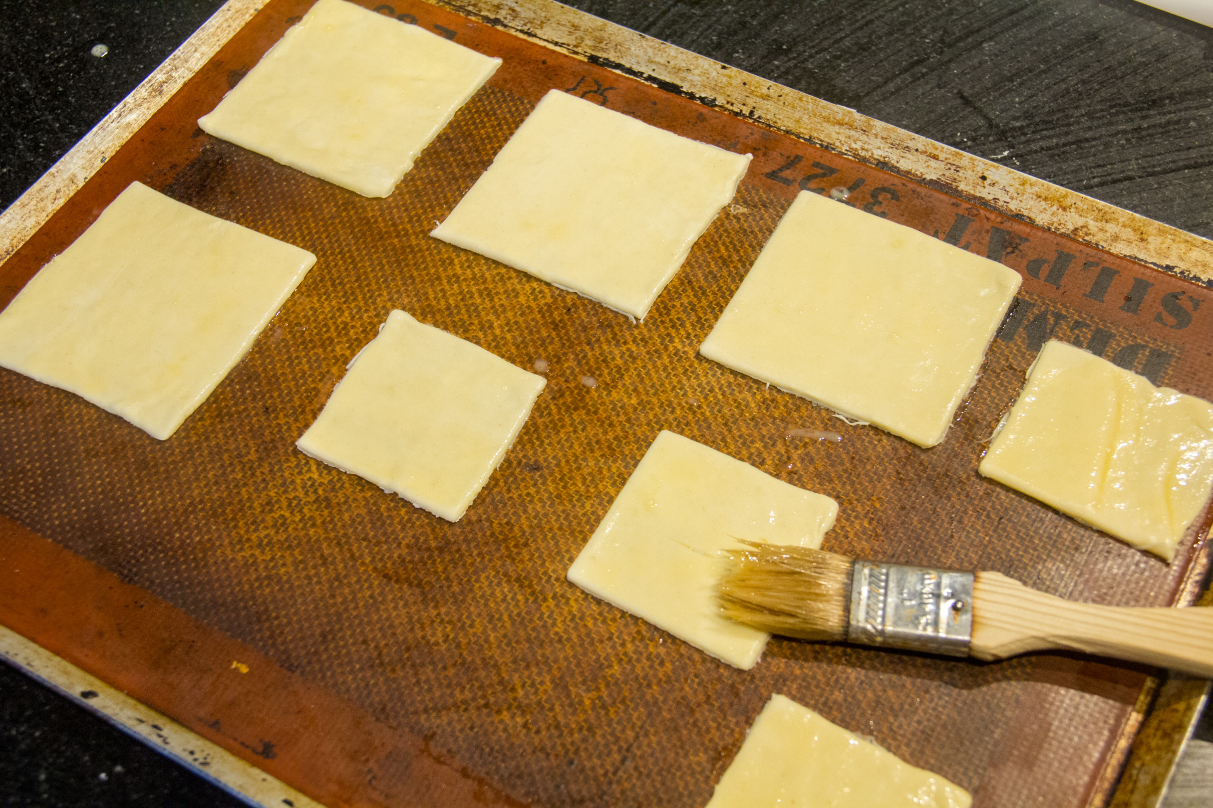 - Disposez les pièces de pâte feuilletée sur une surface anti adhésive. Et dorez à l’aide d’un pinceau avec un peu d’œuf battu. Enfournez à 180° pendant 20 mn. Réservez.