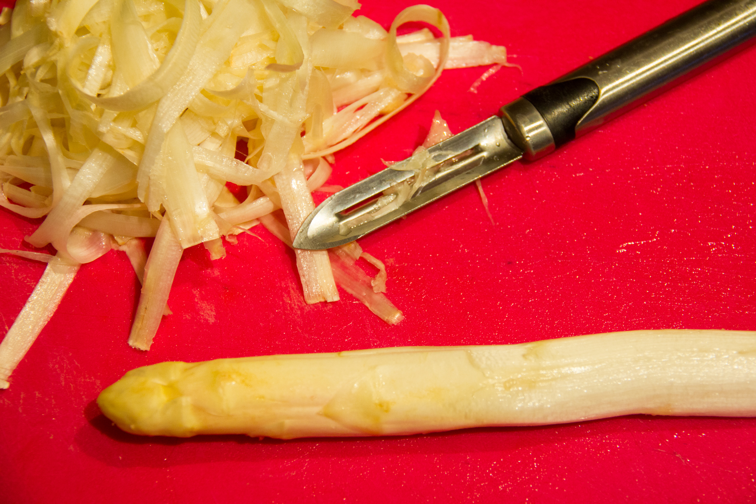 - Si vous utilisez des asperges blanches pelez-les: tenez l’asperge bien à plat sur le plan de travail et posez l’économe à trois centimètres de la pointe puis d’un geste sec ôtez la peau sur toute la longueur. Petite astuce: ne jetez pas les pelures d’asperges. Vous pouvez les utiliser pour en faire une délicieuse soupe…Si vous utilisez les asperges vertes il n’est pas nécessaire de les peler. Coupez juste l’extrémité filandreuse. Réservez.