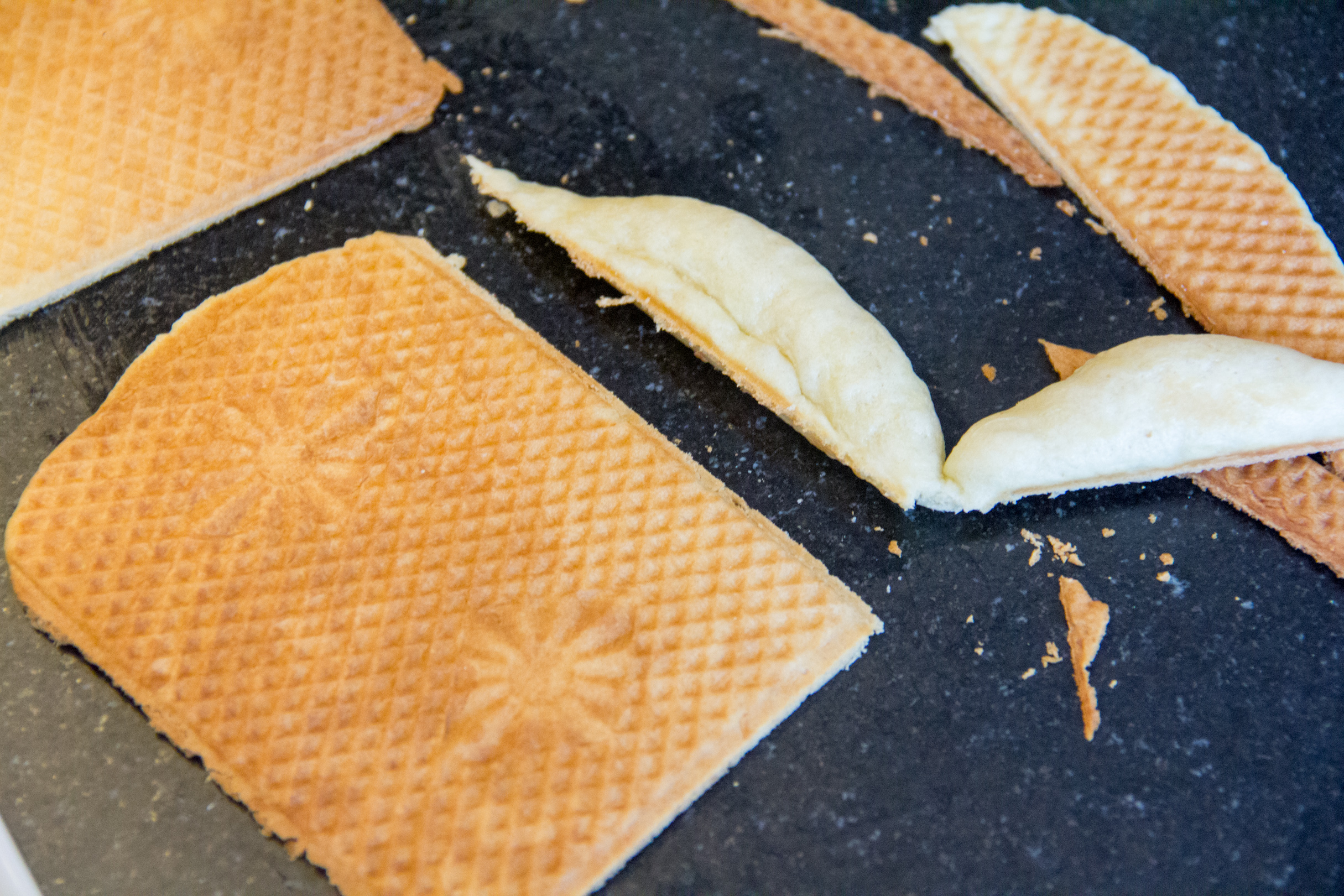- Dés la sortie du gaufrier parez les gaufrettes (coupez les bords pour qu’elles soient bien nettes).