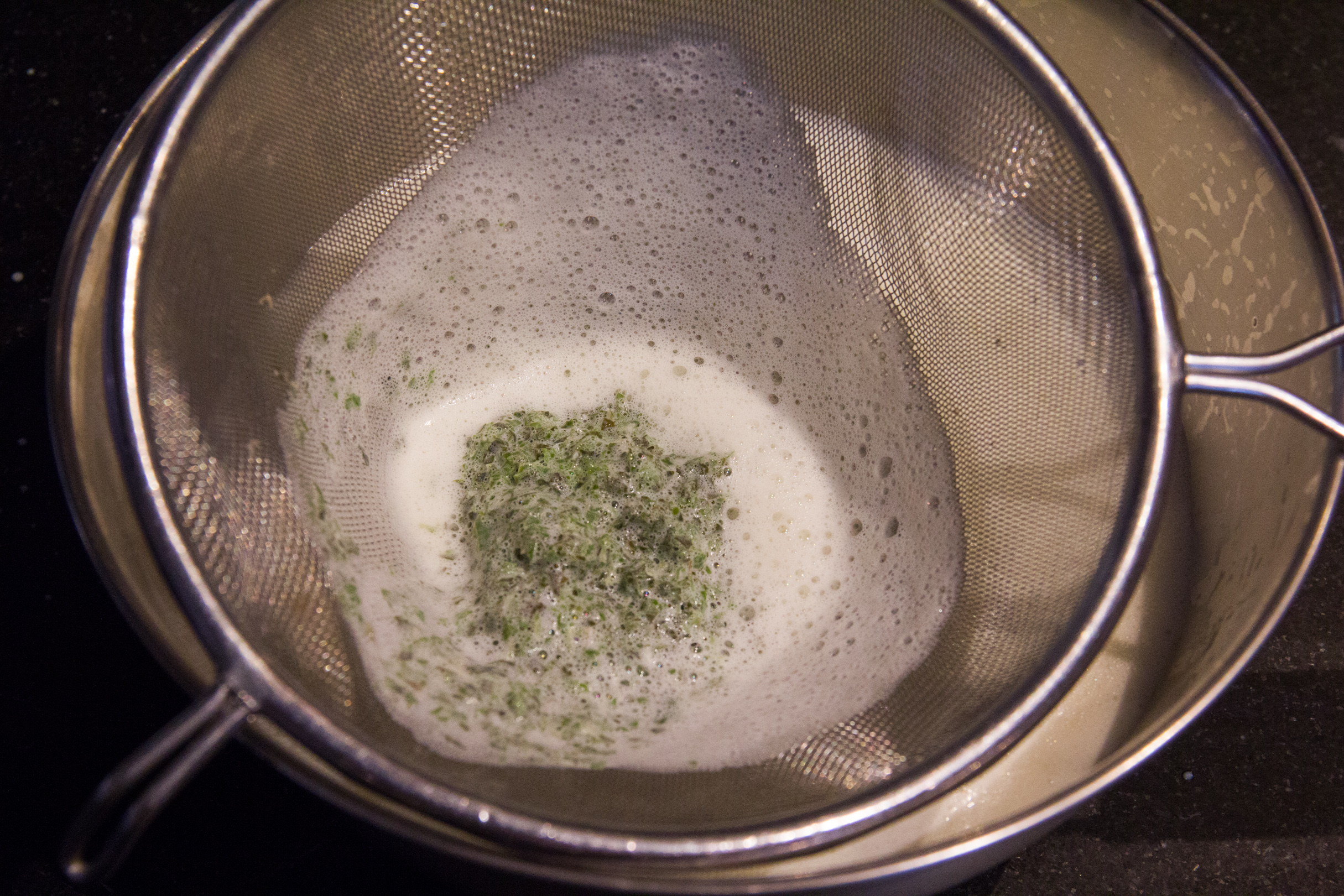 - Passez le tout au chinois et pressez bien les feuilles pour en extraire toute l’essence. Jetez les feuilles.