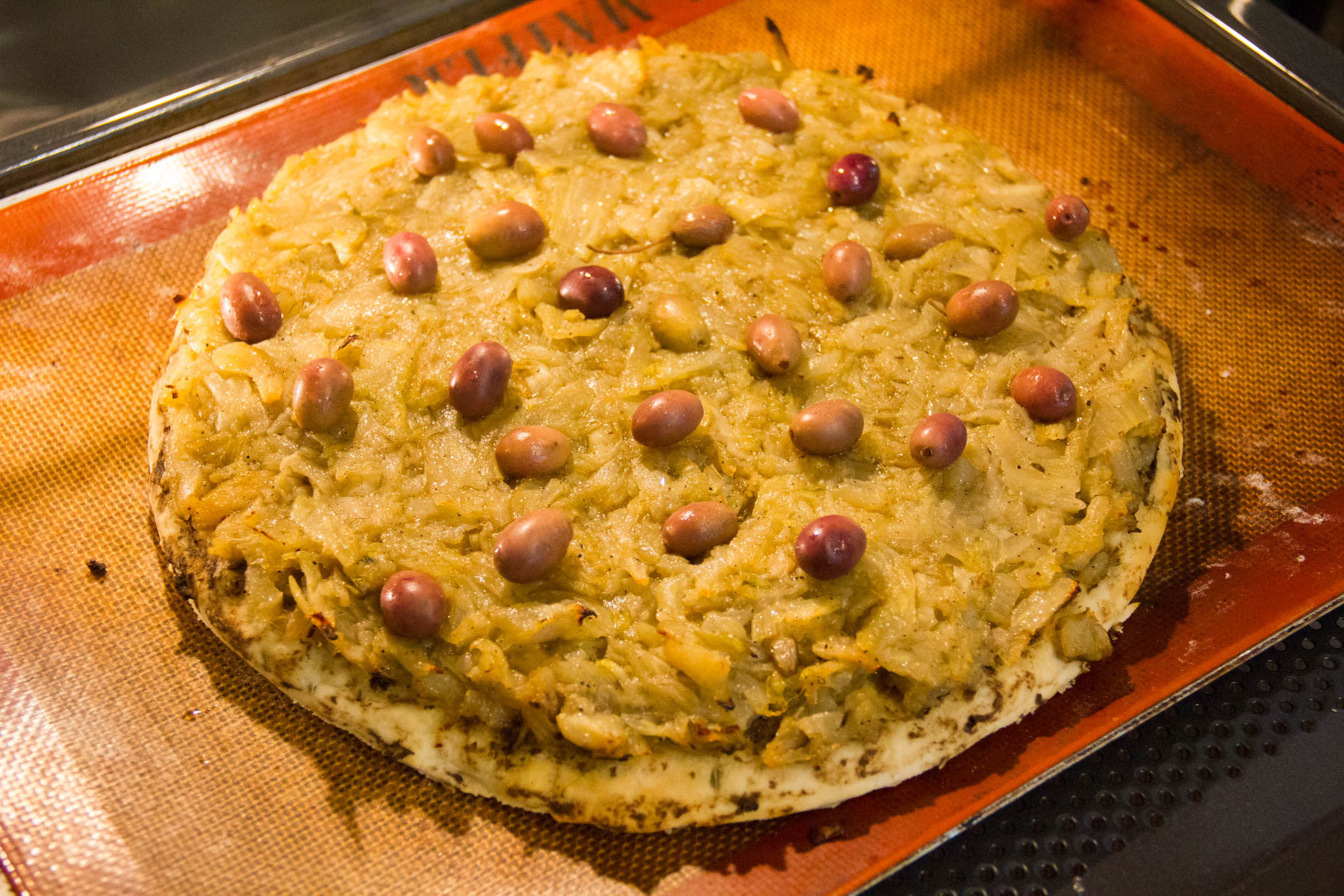 - Puis enfournez à 190° pendant 25 minutes. Je dispose les olives sur la pissaladière dix minutes avant la fin de la cuisson: cela évite qu’elles se dessèchent au cour de la cuisson.
