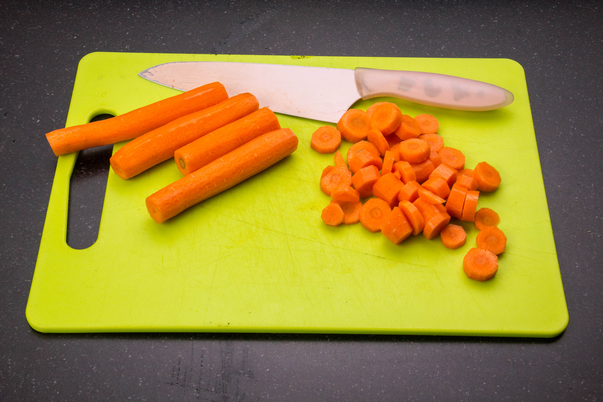 - Épluchez la carotte et coupez-la en petits morceaux.