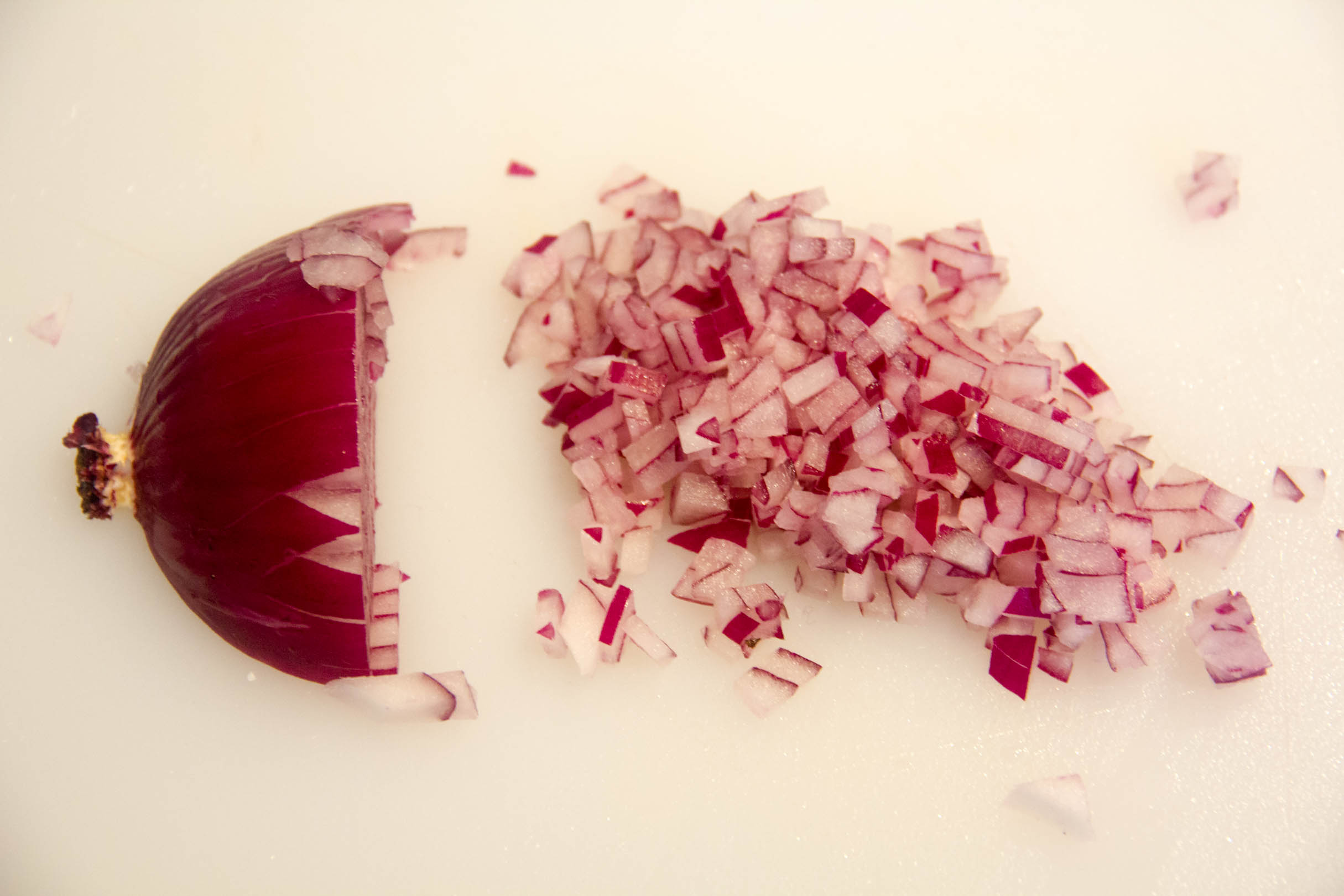 - Épluchez et coupez l’oignon rouge en brunoise (petits dés).