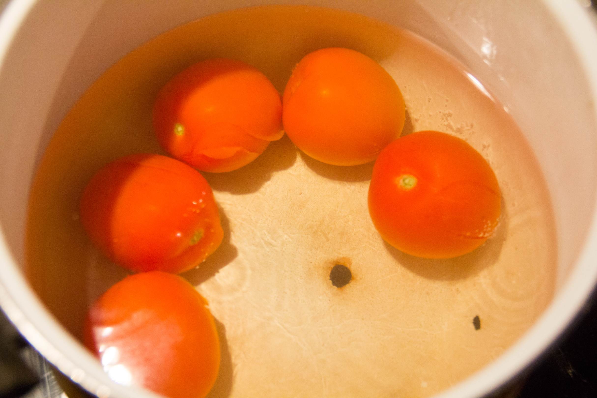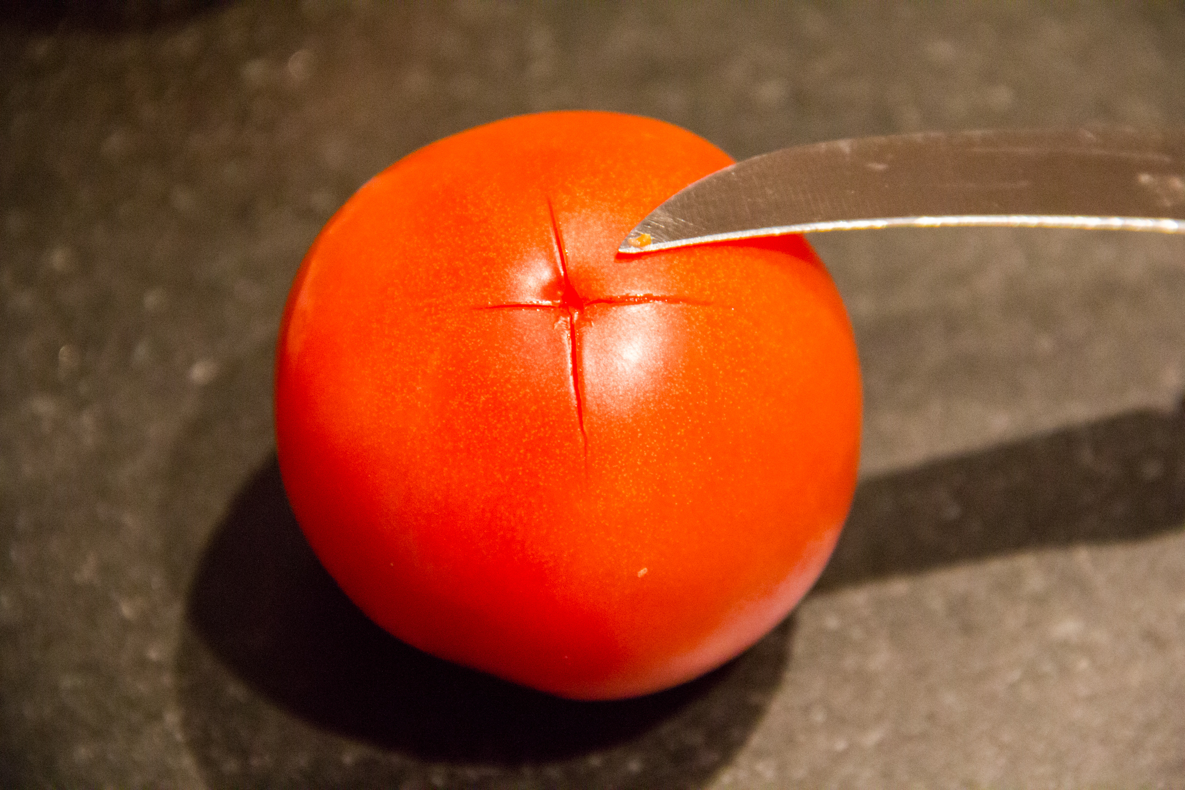 - A l’aide d’un petit couteau tracez une petite croix sur la base de chaque tomate.