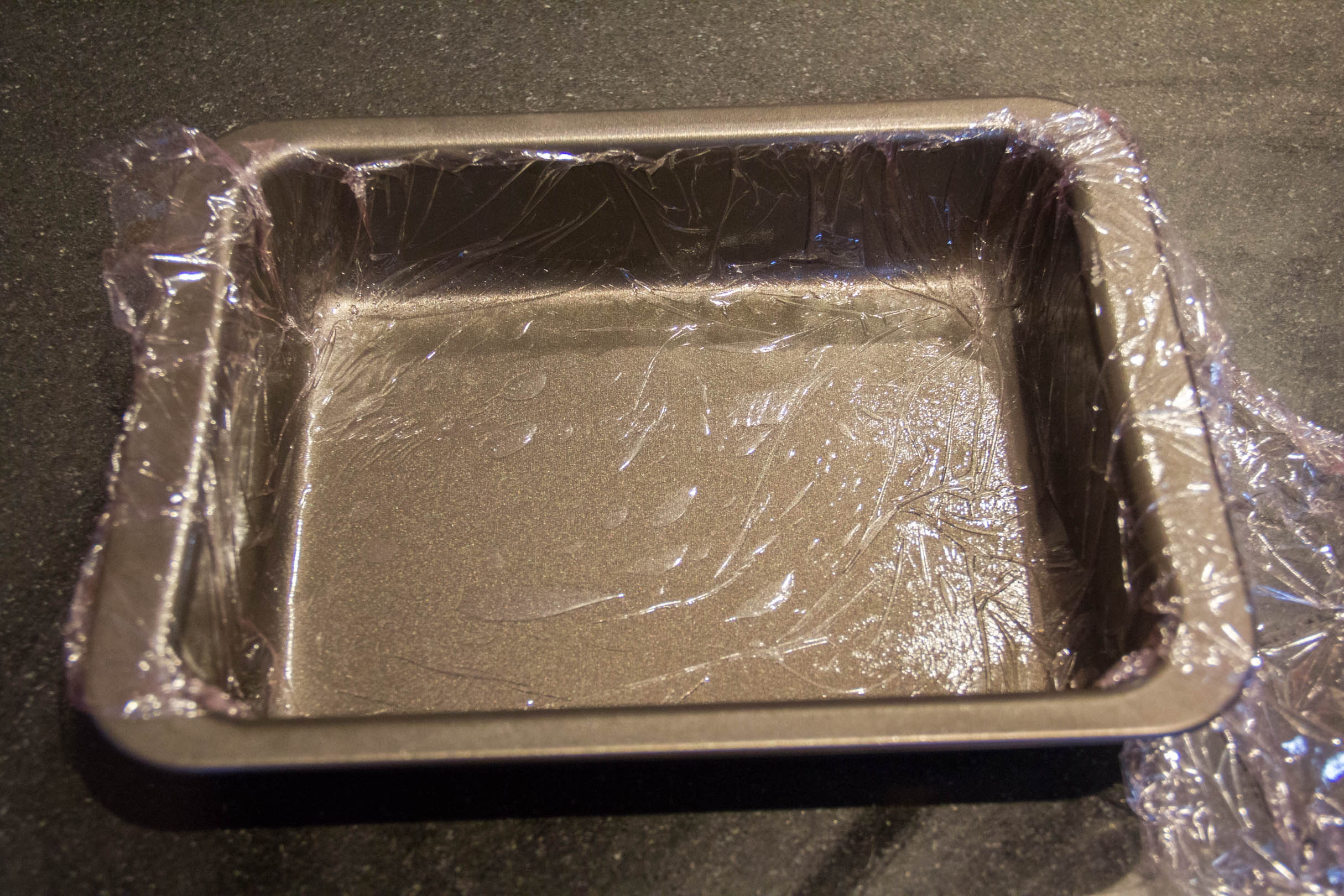 - Huilez un grand plat et tapissez le avec du film étirable que vous lisserez bien. L’huile permet au film de bien adhérer au récipient.