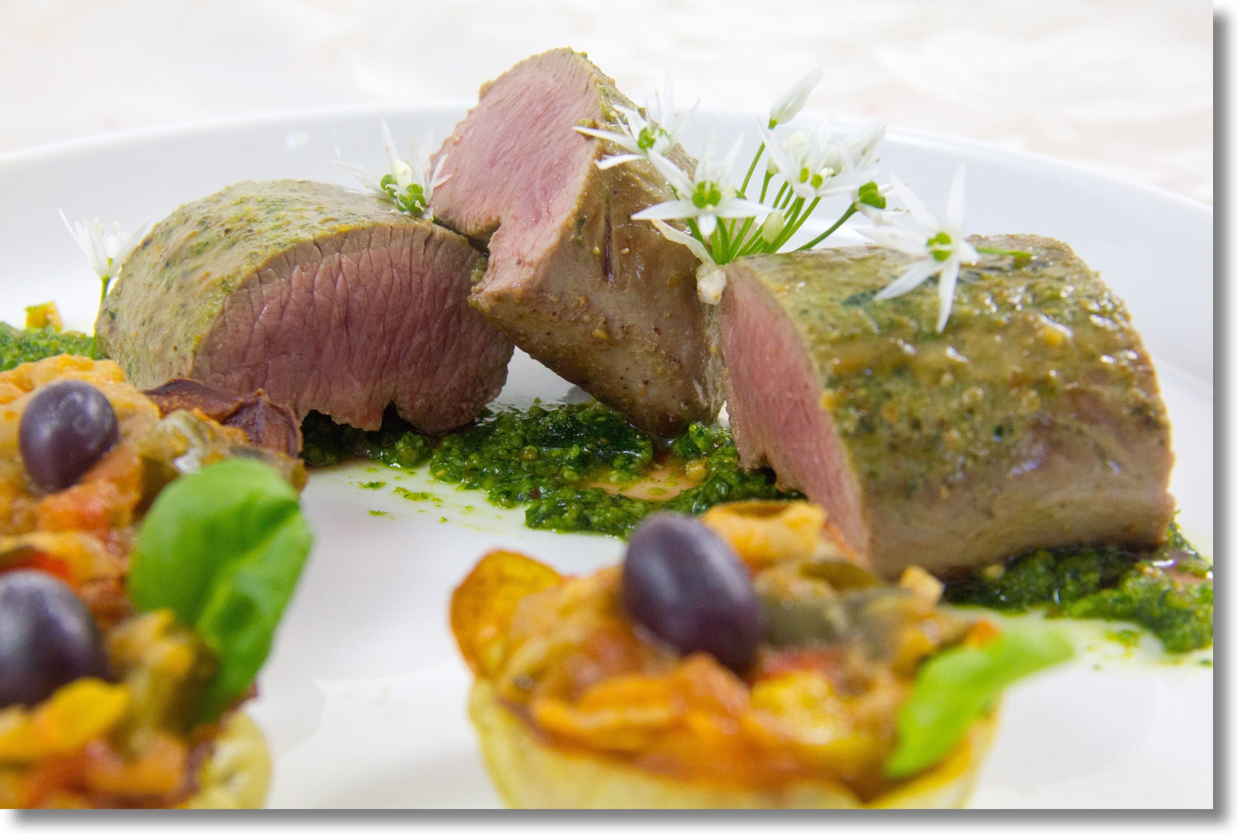 | Lamb Fillet with Ratatouille Cups and Wild Garlic Pesto