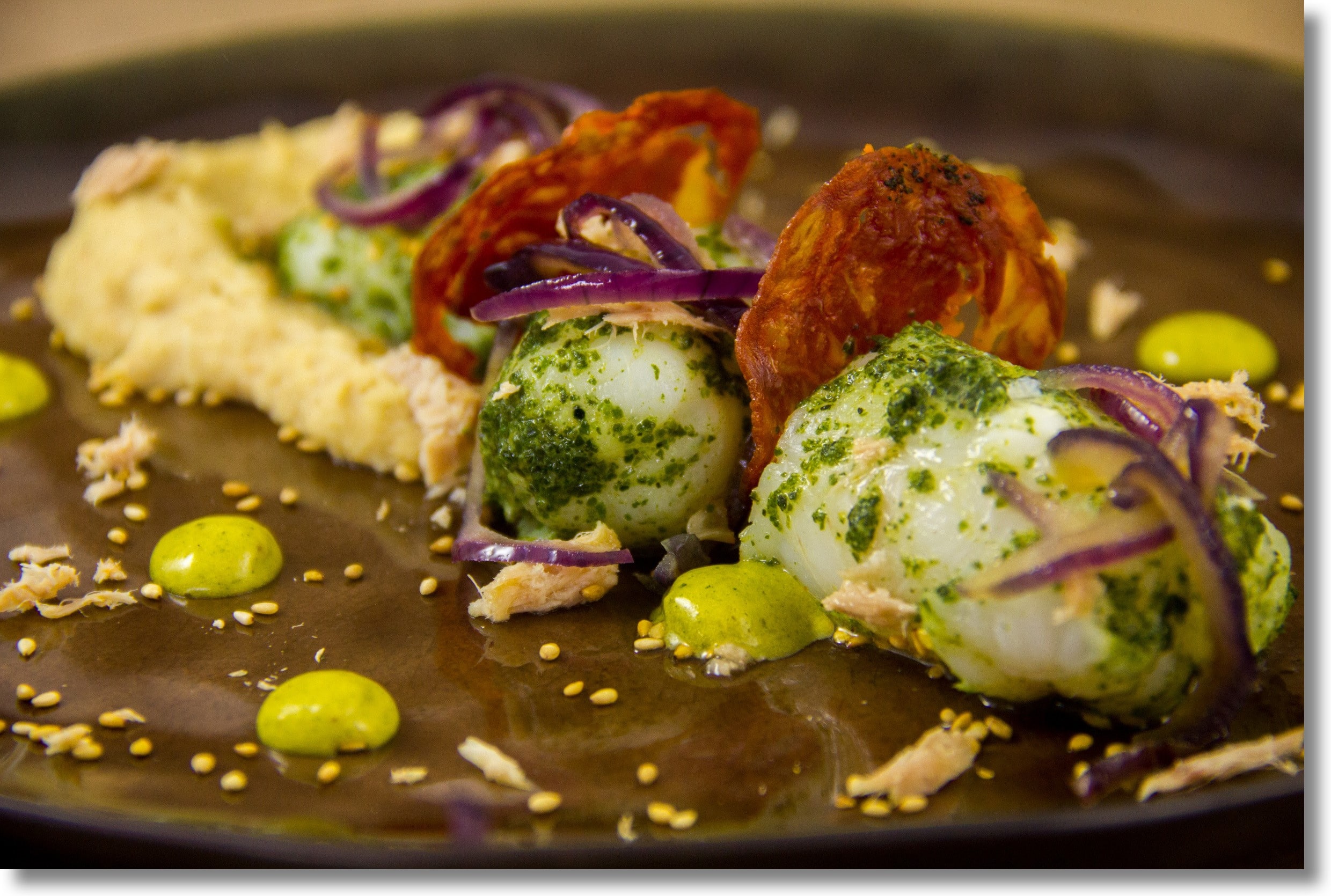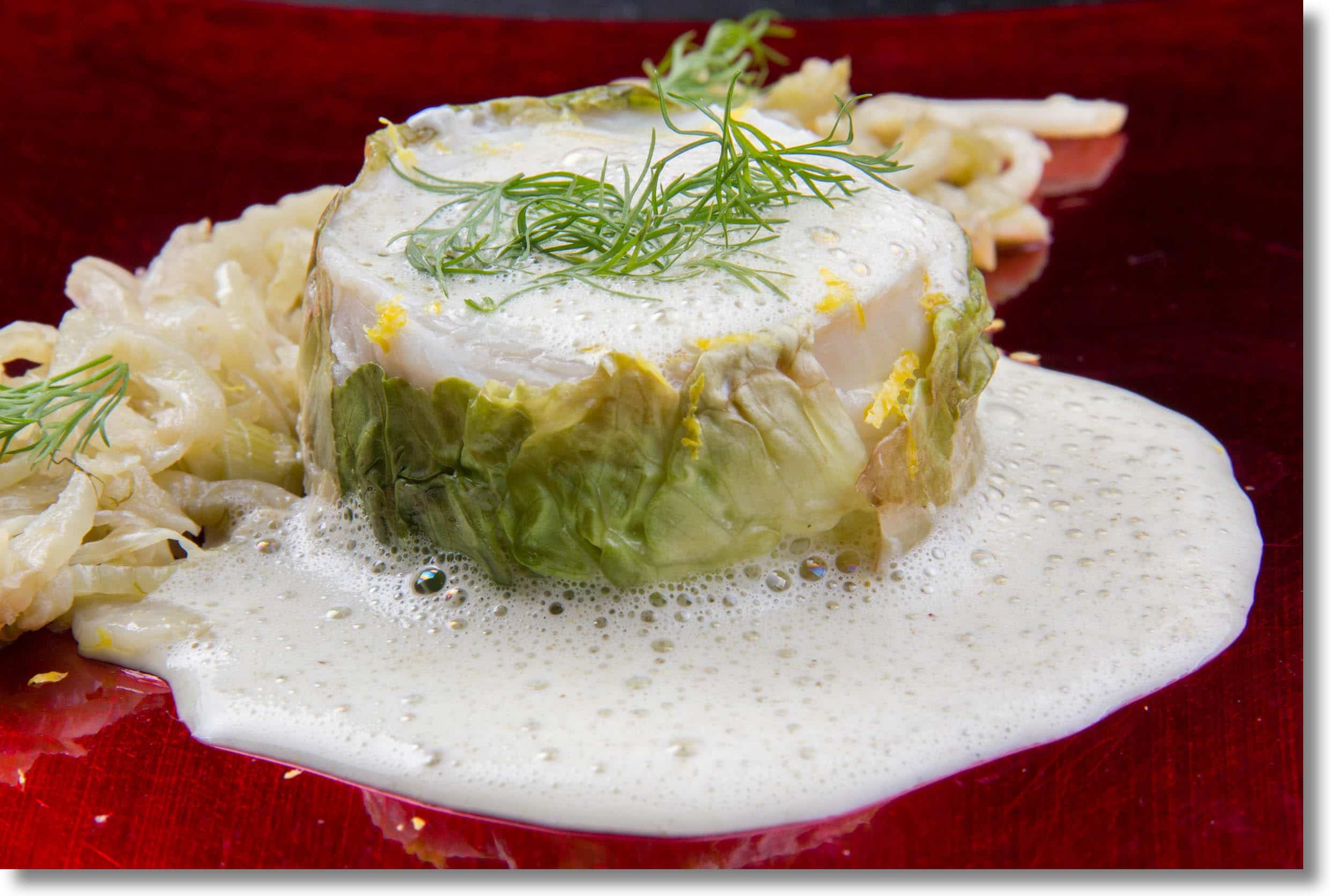 | Monkfish Medallions with Seaweed Powder, White Beans and