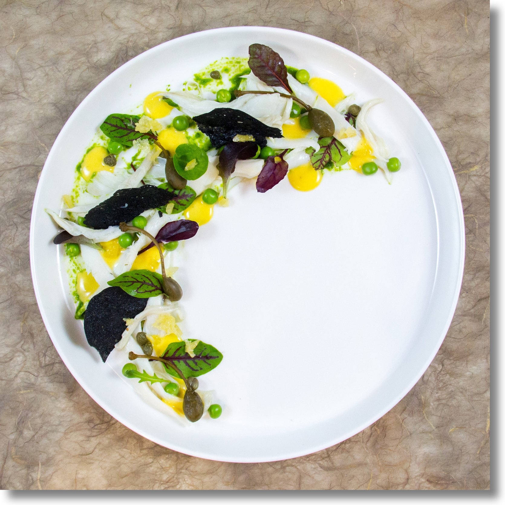 | Skate Wing with Lemon Sauce, Capers, and Cuttlefish Ink Chips