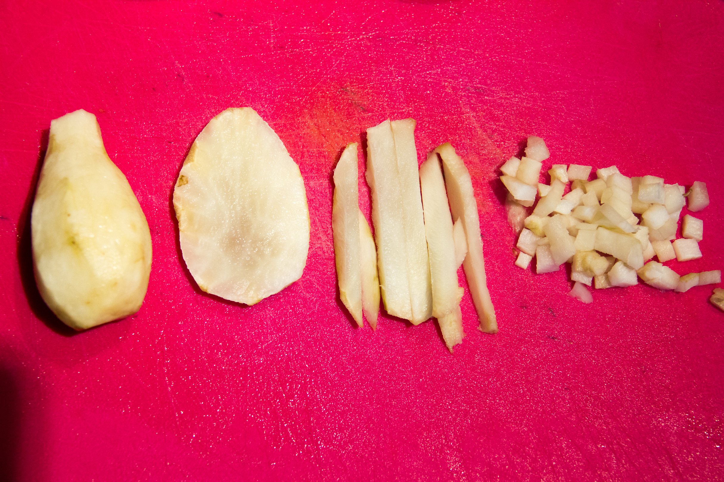 - Pelez les topinambours puis coupez-les en tranches et enfin en fine brunoise (petits dés). Attention: les topinambours noircissent vite à l’air libre: trempez-les au fur et à mesure dans une eau citronnée.