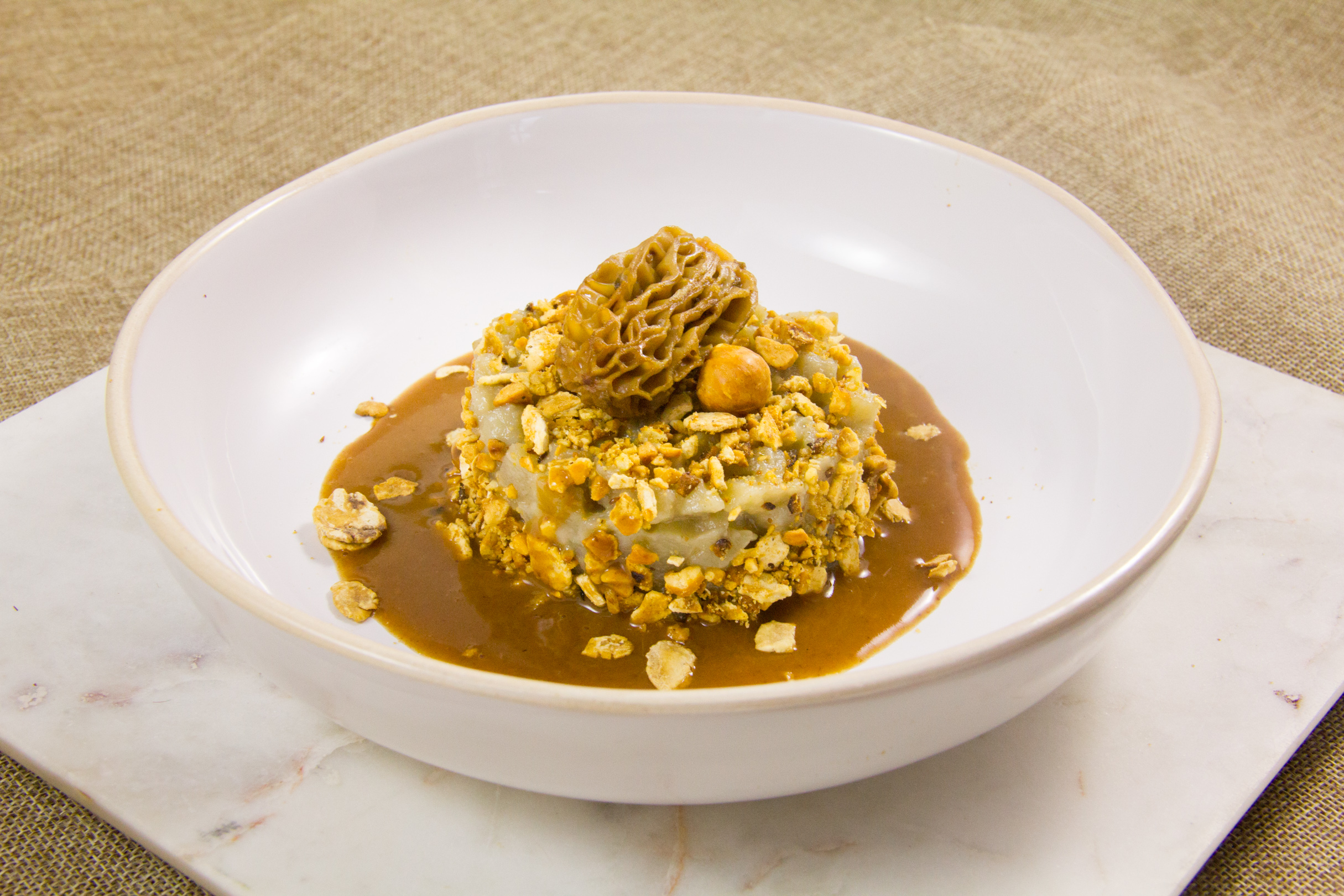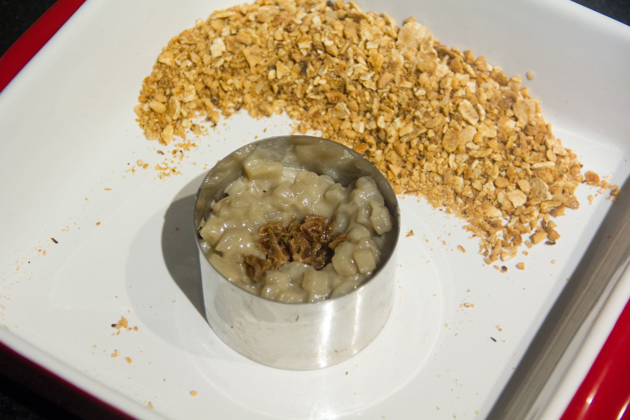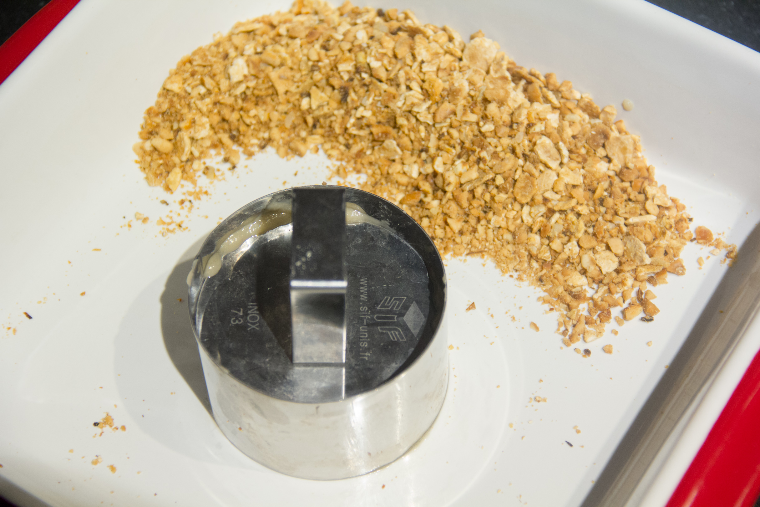 - Disposez votre emporte pièce sur un plat et versez la brésilienne de noisette et ail dans un coin. Remplissez le fond de l’emporte pièce avec le mélange de topinambour réchauffé. Incorporez une cuillerée de brunoise de morille puis recouvrez de topinambour. Puis tassez bien avec le petit couvercle ou une cuillère.