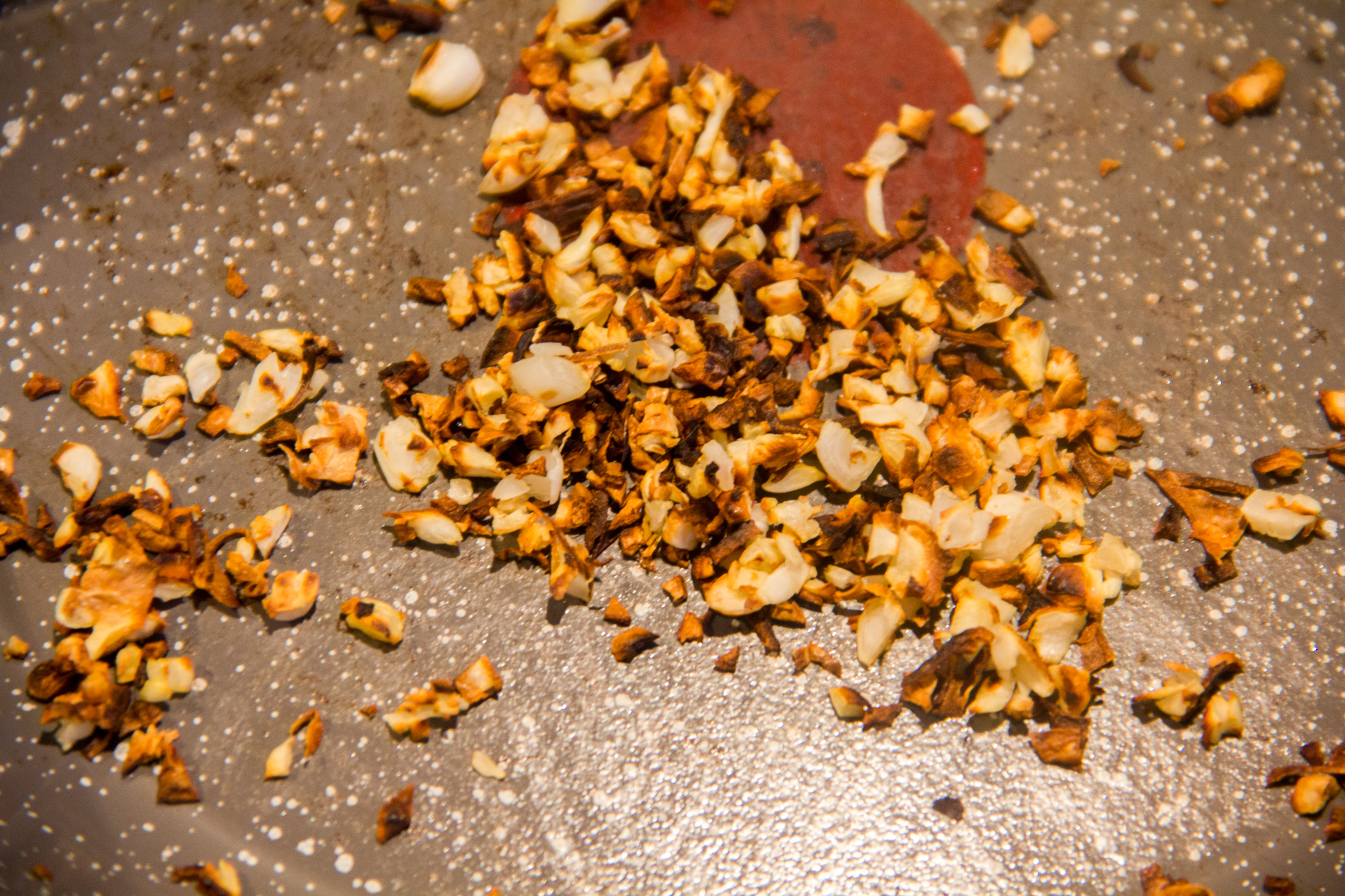 - Faites revenir l’ail à sec dans une poêle en remuant en permanence pour éviter qu’il ne brûle. Il doit être doré.
