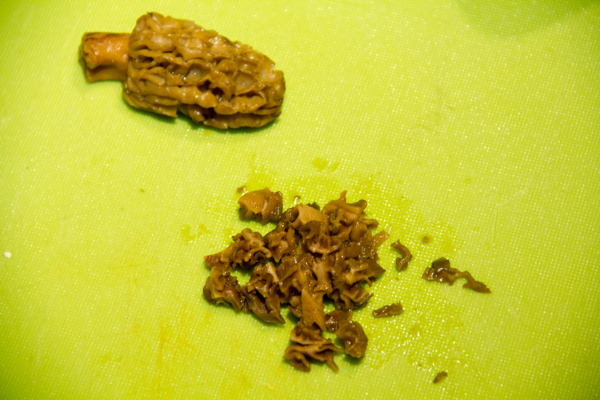 - Gardez une morille entière par assiette et émincez les autres. Réservez.