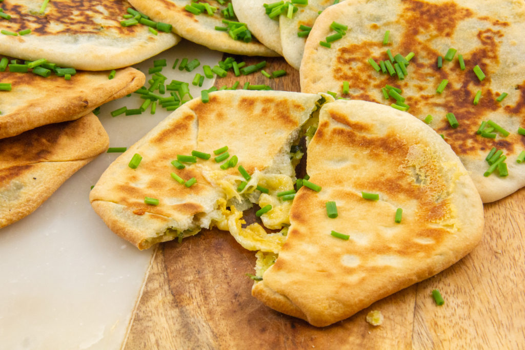 Le naan est une feuille de pain, faite de farine de blé et cuite sur la paroi brûlante d’un four. C’est un pain de consommation courante dans plusieurs régions d’Asie; il se prépare soit nature, soit fourré. Je vous le propose aujourd’hui au fromage et aux herbes.