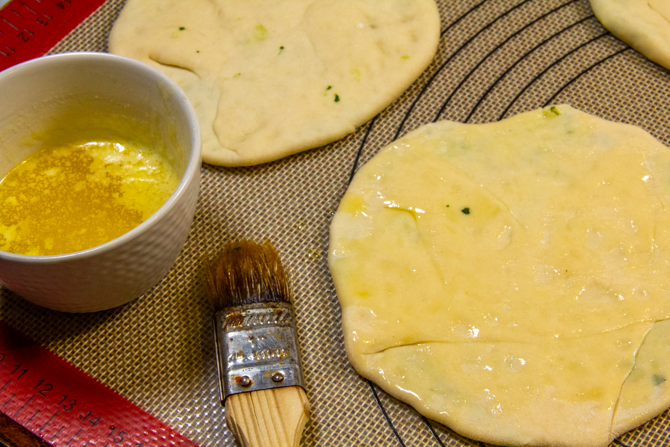 - Badigeonnez les naans de beurre fondu et placez au four à 200° pendant 6 minutes. Retournez-les et poursuivez encore la cuisson 5 mn.