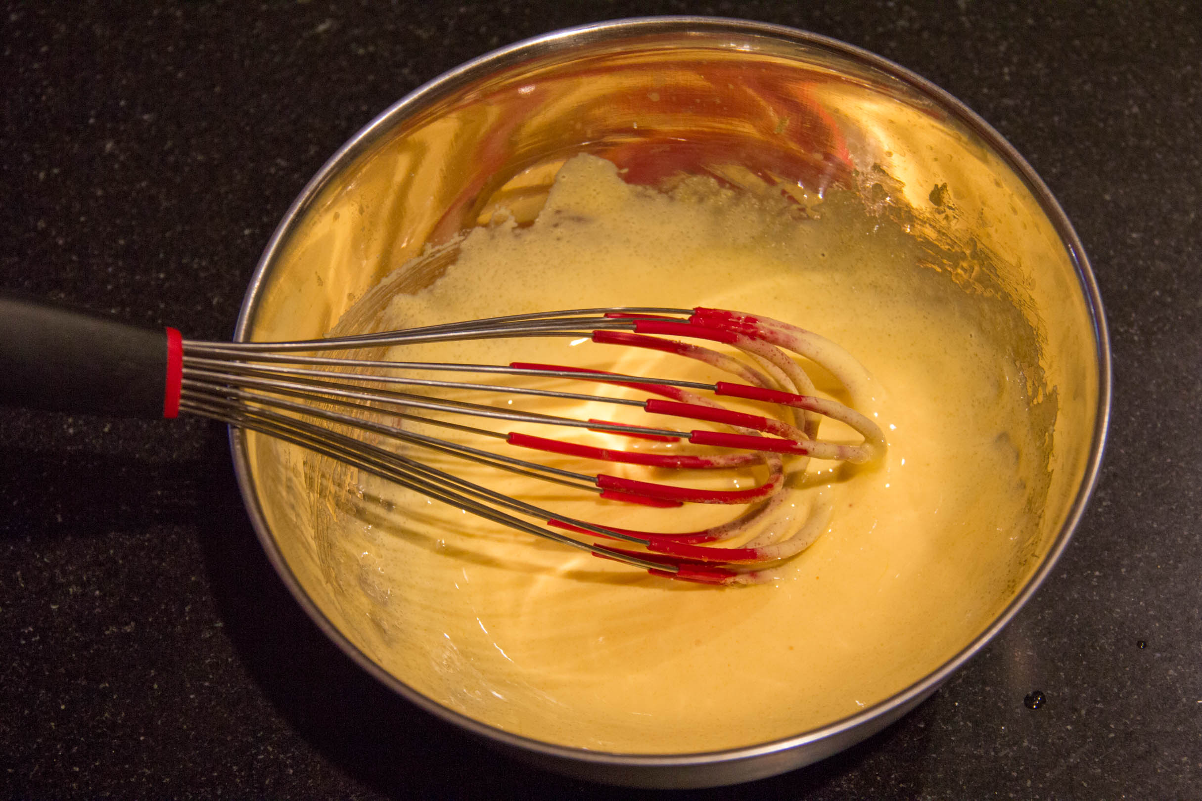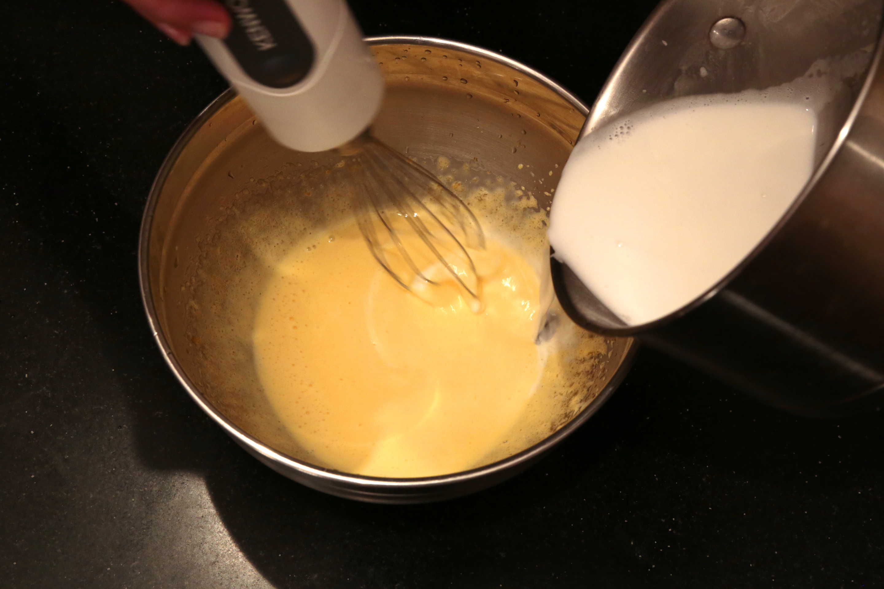 - Versez progressivement le lait chaud mais pas bouillant sur le mélange jaunes d’œuf/miel tout en fouettant avec le mixeur.