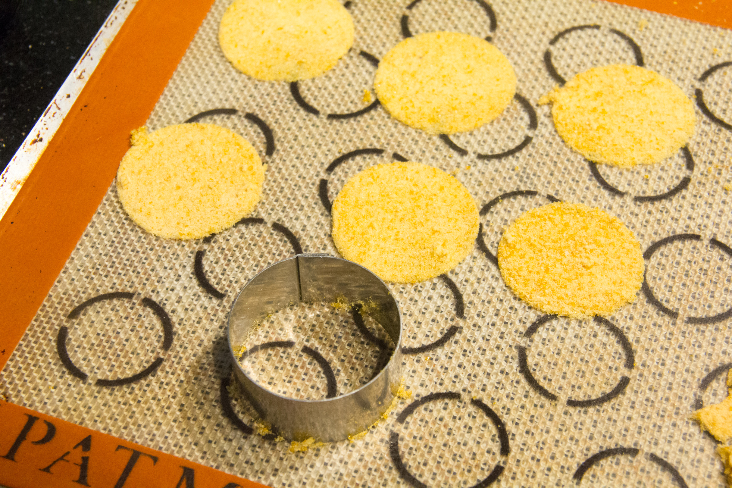 - Utilisez un emporte pièce pour réaliser des petits tas réguliers de poudre de caramel d’environ 4 cm de diamètre. Si vous n’avez pas d’emporte pièce ce n’est pas grave, déposez la poudre avec une cuillère et tassez un peu: vos disques de caramel seront juste irréguliers. Enfournez à 180° pendant environ 8 mn: le caramel doit refondre et former de jolies pastilles.