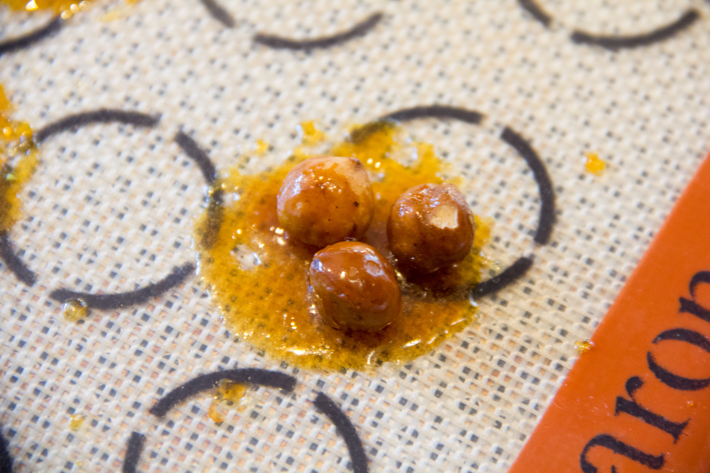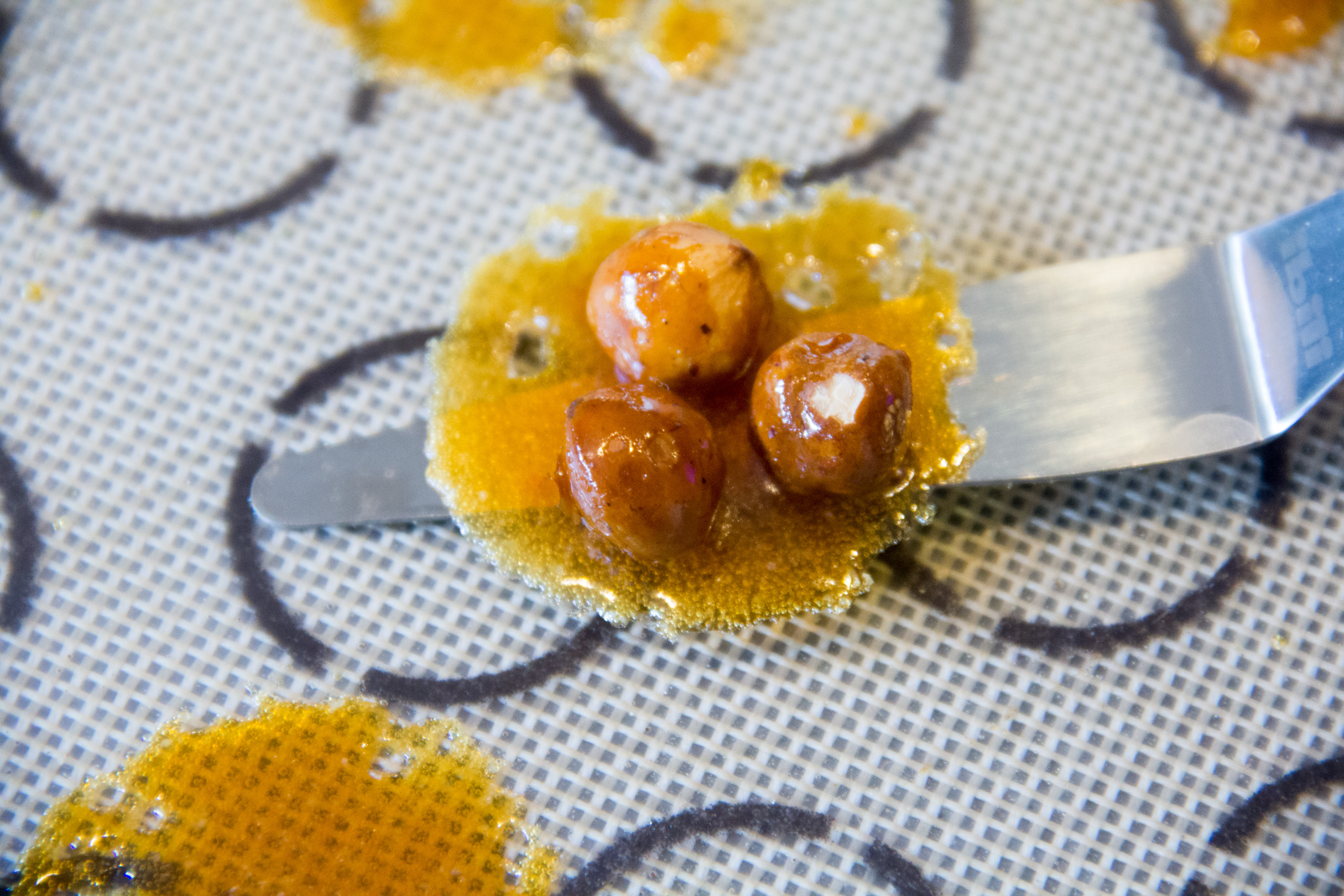 - Débarrassez les noisettes caramélisées sur un revêtement anti-adhésif. Laissez refroidir et mettez les noisettes dans un récipient hermétique.
