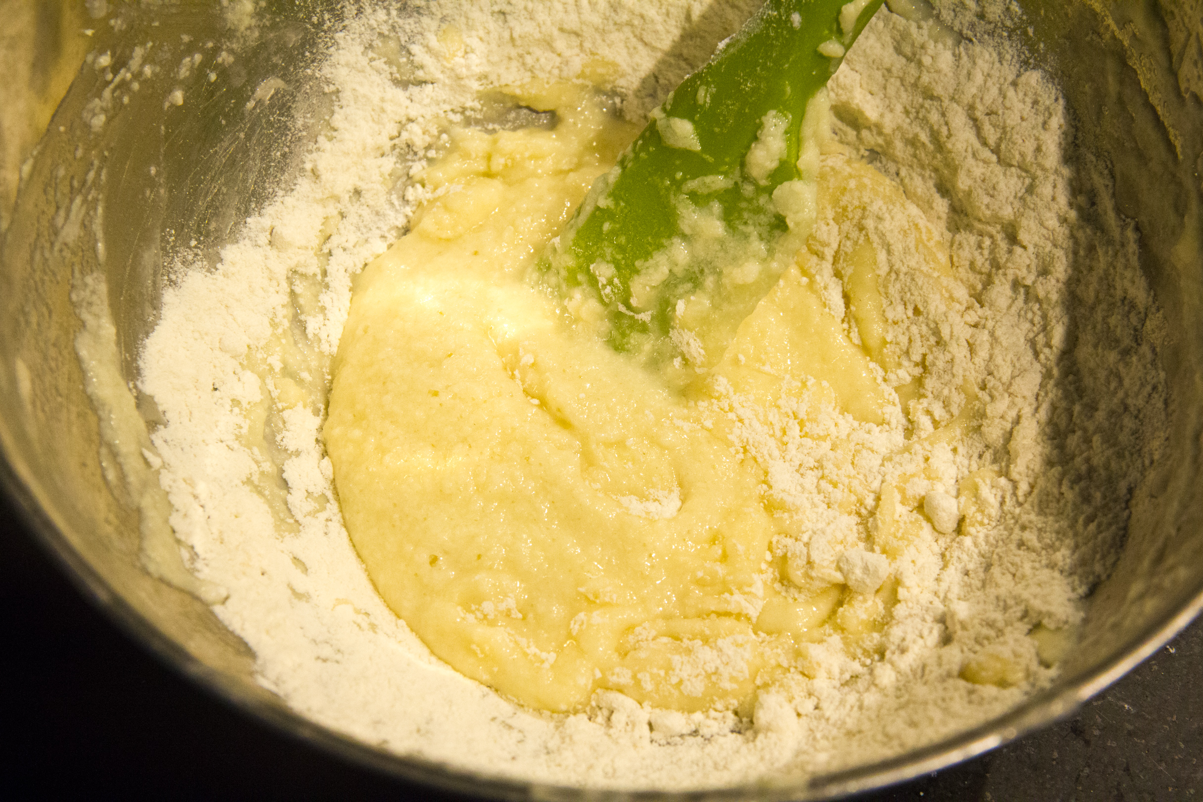 - Mélangez intimement le beurre mou et le sucre. Vous devez obtenir une crème assez lisse. Ajoutez les blancs d’œuf et la farine tamisée.