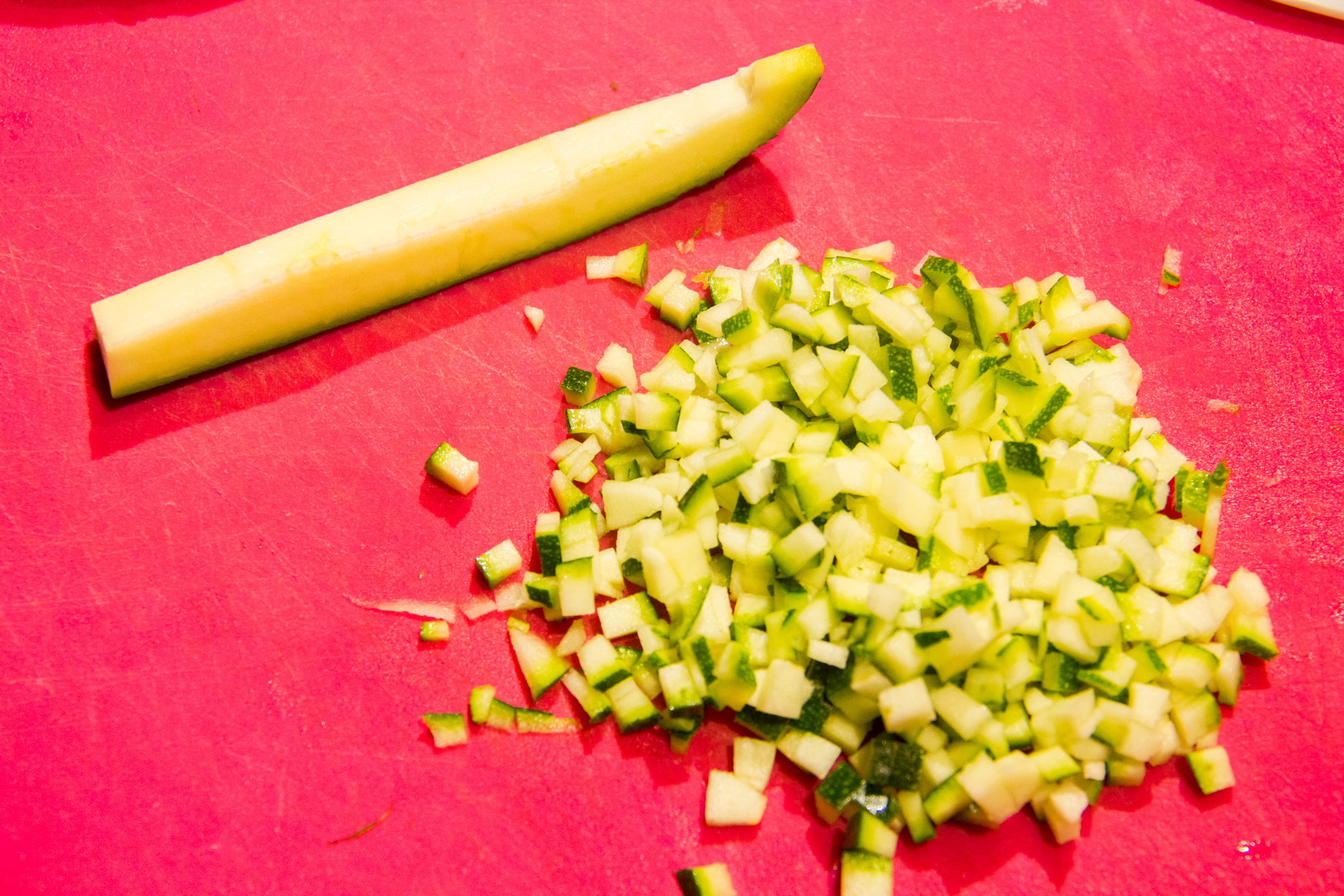 - Coupez la courgette en tout petits dés et rajoutez les aux oignons. Cuire 5 mn.